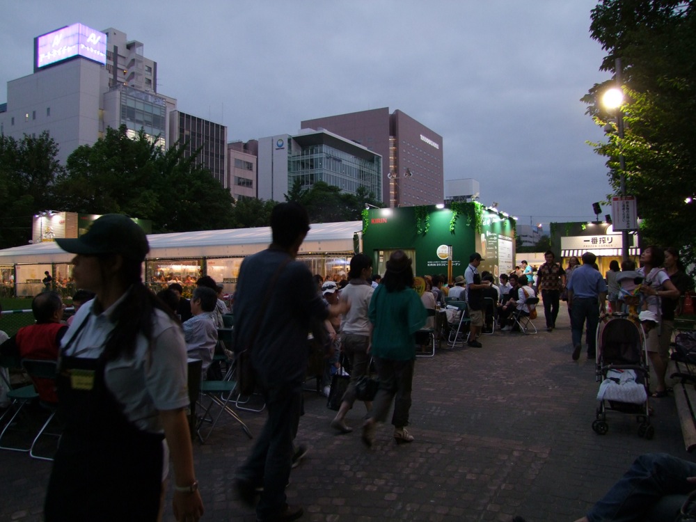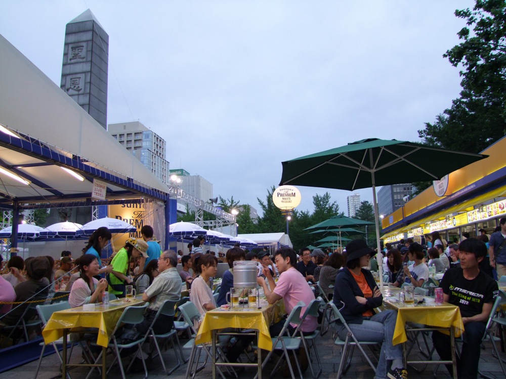 ここは、会場を大通公園とさせたビアガーデンで、大通公園の5丁目から11丁目に亘った、かなり長いエリアに6つのブースを確保。…それぞれ、サントリー、アサヒ、サッポロ…等々、それはそれは名立たるビール・メーカーのビアガーデン・ブースが設置されていて、その席数は合計約13000席!…説明されただけで楽しくなってきてしまいますが(笑)、気を付けなければいけないのが、どうやら営業が21:00までらしいのです。この時点で、既に時計は18:30頃になっていて、どのブースに行くのか、どのようなペースで飲んでいくのかは、わりと計画的にならなければいけないのかもしれません。