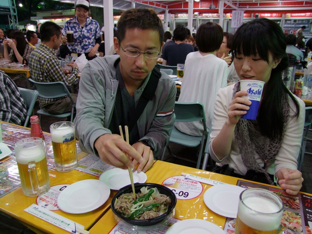 ビールの他に枝豆等も注文し、テーブル上での華を咲かせますが、実はゆっくりと飲んでいるわけにもいかないのです。与えられた時間は25分ですが、実際、チケットを買って席に座り、注文して品物が出てきて、いざ乾杯…と、この順序で既に10分位は経っているのです(笑)。これは予想以上に大変な挑戦をしているのではないかと思いつつ、潔く良く?次のブースであるアサヒに向かいました。