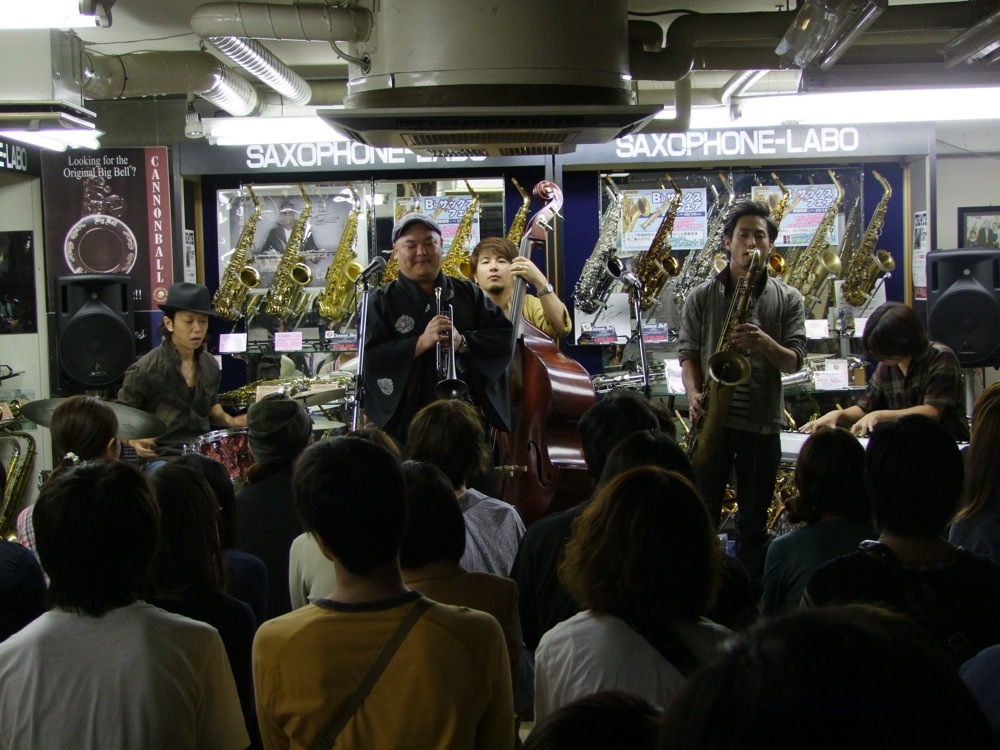 また、ここは昨年の『わらべ JAZZ』の時にも、インストア・ライブとして演奏をさせて貰っていて〔TRI4TH『わらべ JAZZ』インストアライブ参照〕、聞くと、事ある毎に関わりのある場所でもあるとか…(メンバーの使用楽器を見ても、そうですからね…)。CDをリリースする度にこの場所に帰ってきて、そして演奏をやらせて貰えて…、もはや自分達の成長を確かめ合うような場所…と見るのは、考え過ぎでしょうか…。