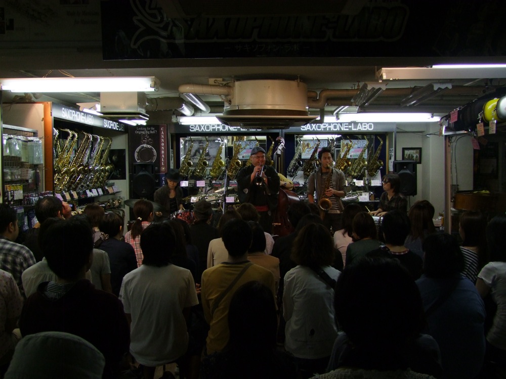今回も、多くの方にお越し頂きました!…予約制となっていたのですが、これは満席と言っても間違い無いでしょう。また、今回は1段分?の高さのステージが用意されていて、インストアという状況とは言え、より本格的な演奏をお届けしなければいけないプレッシャーのようなものを感じさせてくれました(勿論、常にそうなのですが…)。ステージ時間もたっぷり1時間は予定されていて(実際、盛り上がってしまって、1時間20分くらいは演奏していました…笑)、これはもうインストア…と言うよりは、普通に“ライブ”でした。