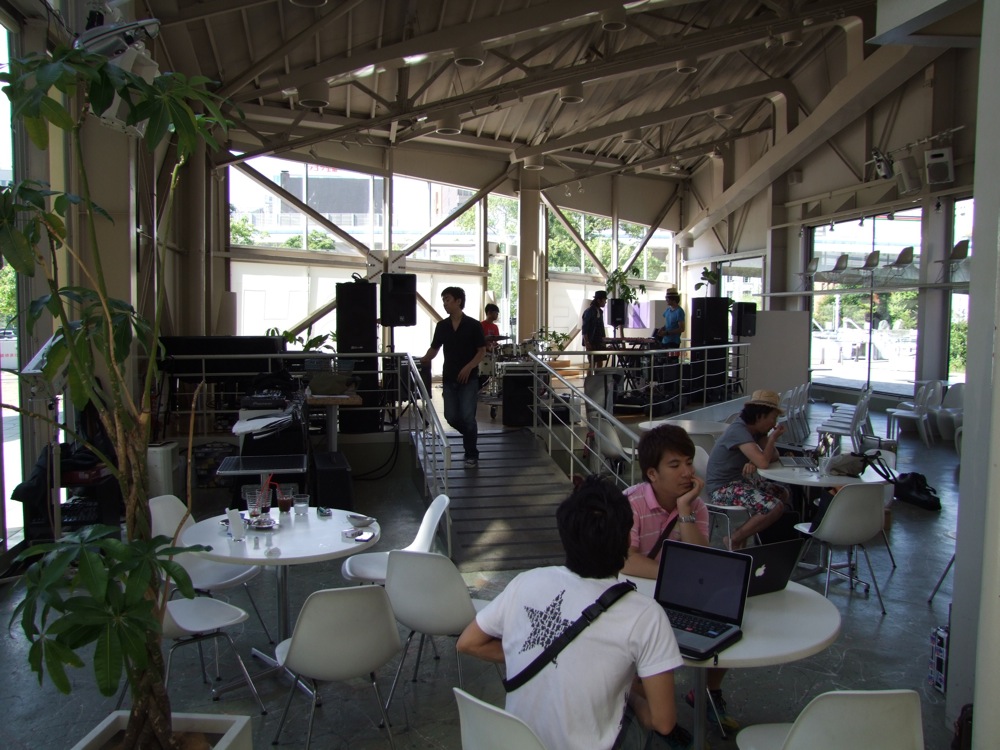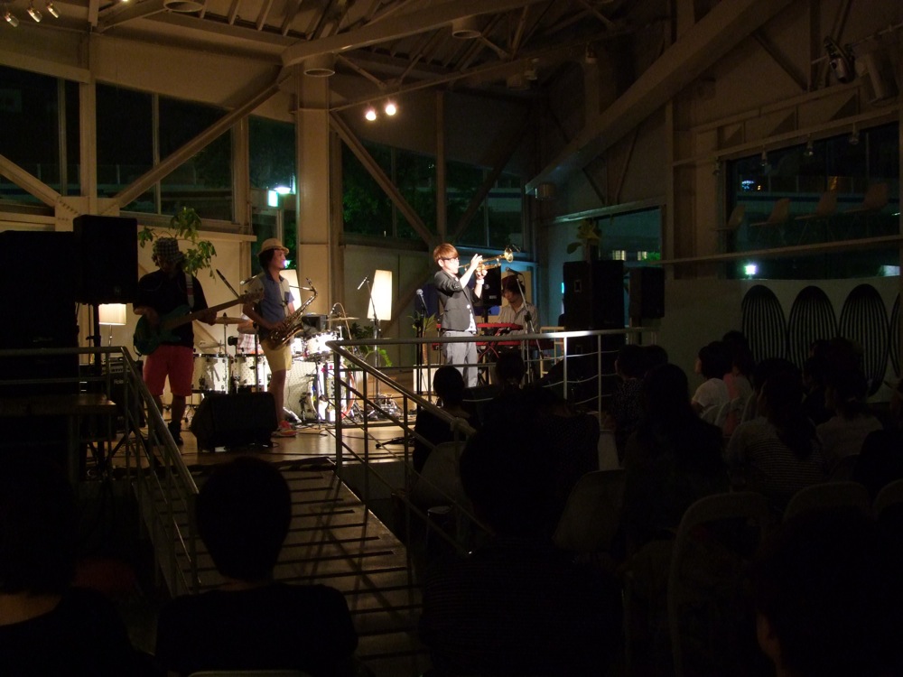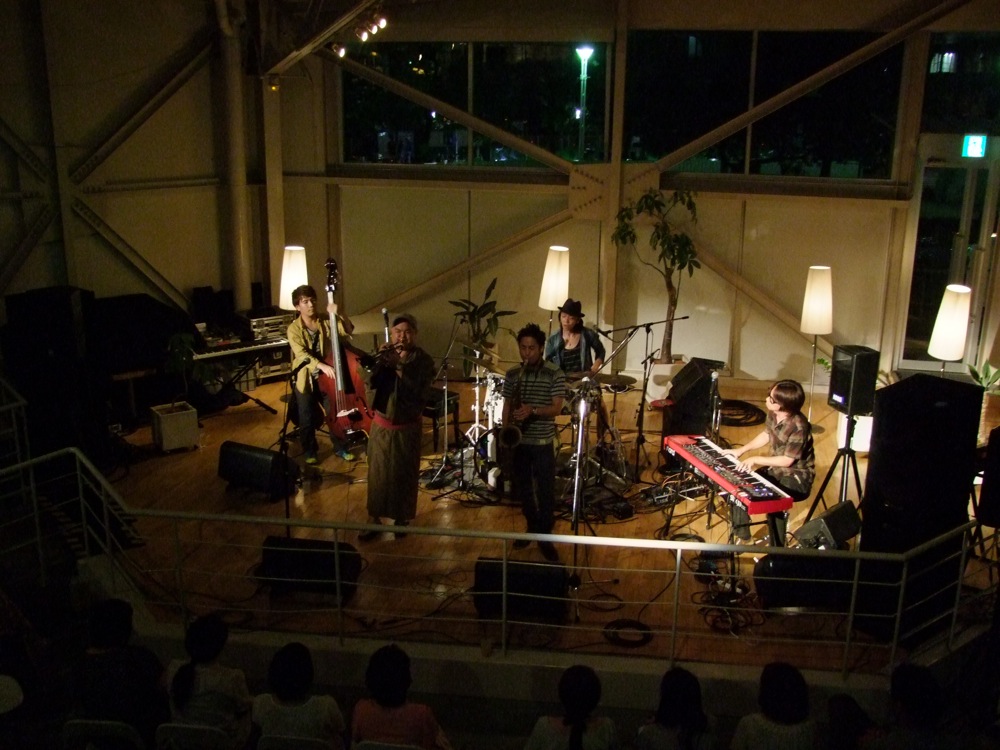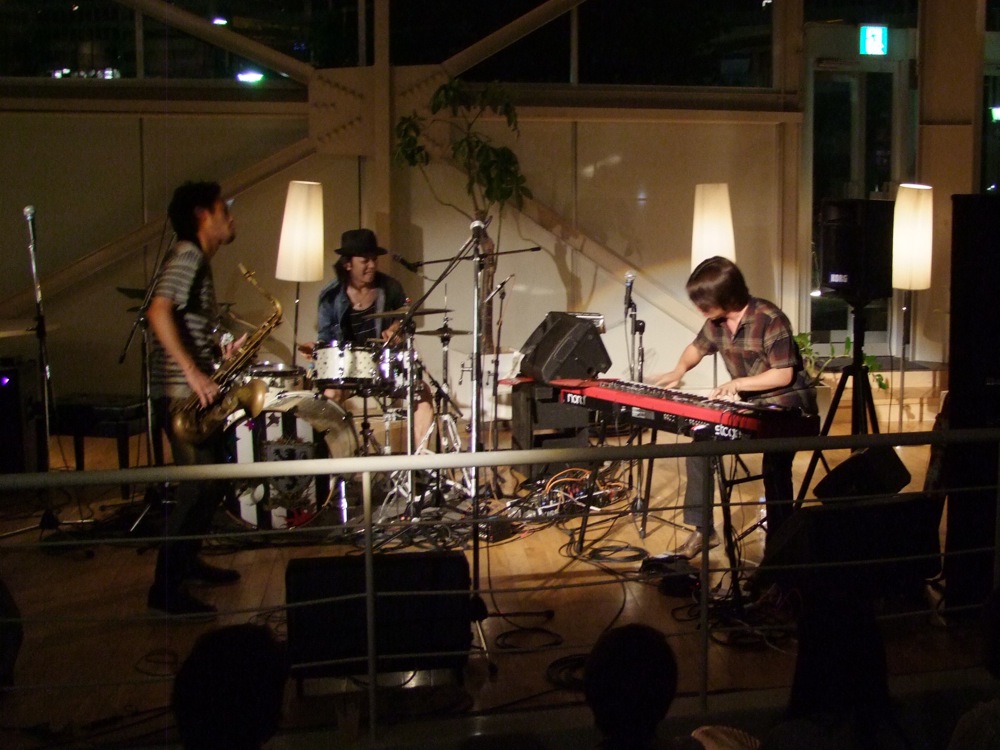 結果的に、苦労してお店に着いた感じになった(笑)自分達でしたが、ここで JABBERLOOP の一同と合流。久し振り…と思いきや、このツアーの1週間前に行われた“渋谷Jazz Jungle”というイベント〔すみだジャズ→ Jazz Jungle 参照〕でも御一緒していたので、むしろ「また」という感じでもありました。しかし、地域が変わってお会いするというのは、やはり雰囲気を変えてくれるものなのです。今回のオープニング・アクトとなっていた“シカキム”というユニットも、やはり“Jazz Jungle”で御一緒したカルメラのメンバー2人によるものだったので、同じ事を思いましたね。徐々に、神戸に来たという感覚が強まってきたのかもしれません。