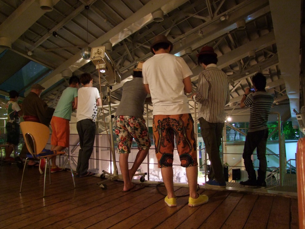 ちなみに、このお店のステージは吹き抜け風になっているのですが、1階が客席のスペース、では2階は…と言うと、出演者の楽屋になっているのです(まあ、本来の使い方かどうかは分かりませんが、2階の空いているスペースをそのように使った…という感じです)。そして、2階からは皆で左下写真のように見ていました(笑)。なかなかプレッシャーを与えてくれている図でもあります。ちなみに、カルメラのリーダーであるゴウシ君も、この日駆け付けてきてくれていて、何故か照明を手伝ったりする場面もありました(笑)。なんと和気藹々とした空間なのでしょうか…。