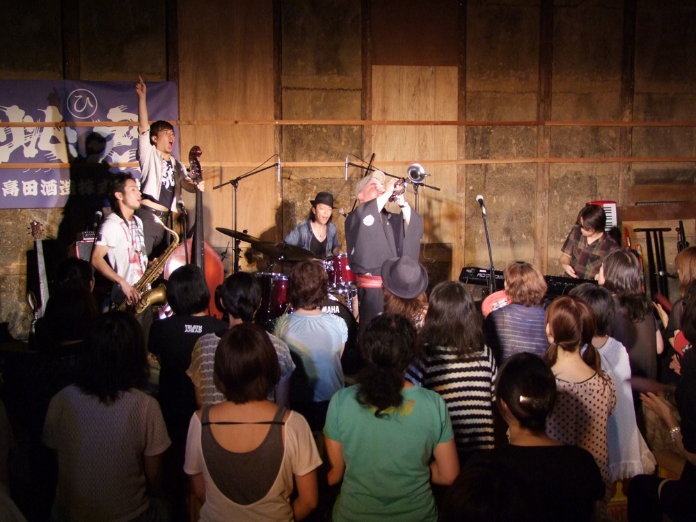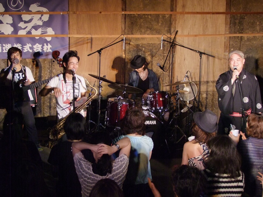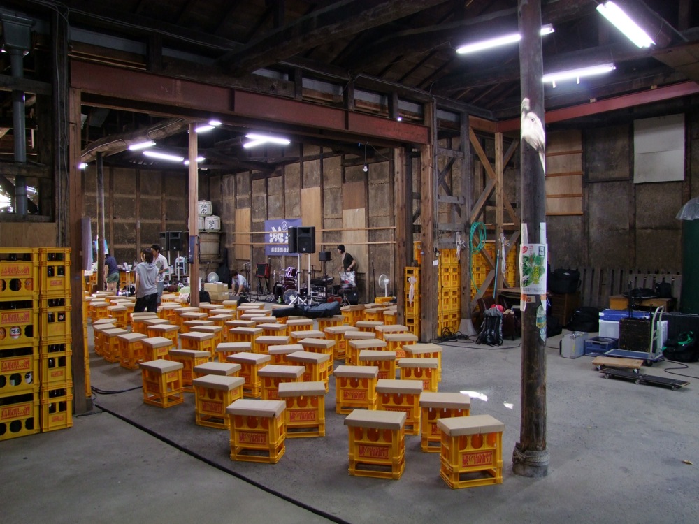 そして中に入って驚きでした。高田酒造でライブ…と確かに自分達は聞いていたわけですが、本当に読んで字の如くの状態が建物内に造られていました。蔵造りの倉庫という場所に位置するのかは分かりませんが、そこに手造りっぽい客席とステージが設置され、何とも渋い空間が出来上がっていたのです。端には大きな樽も置いてあって、確かに酒造である事を窺わさせるというものですが、ここでライブをやるというのは新鮮です。敢えて言うなら、中にはエアコンの類が無く、何台かの扇風機で涼をとるしかない状態だったのですが…、成程、確かに面白い企画だと思いました。