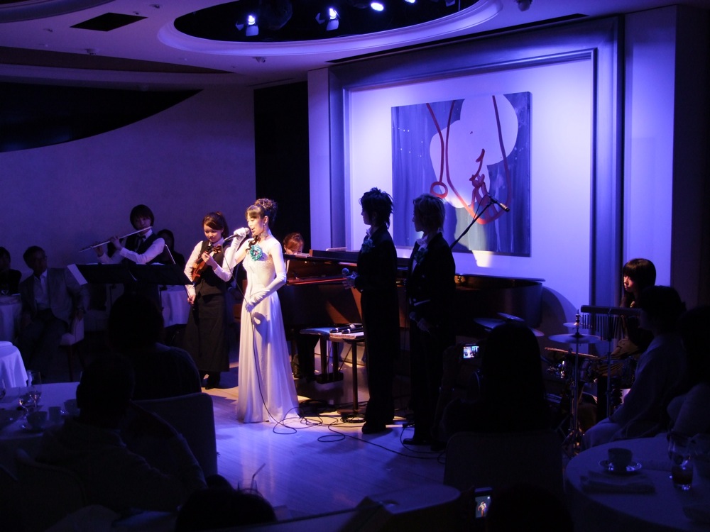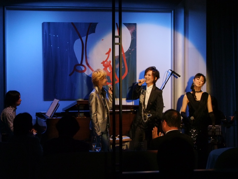 さて、次のコーナーですが、la JEUNESSE のキャストの方とのコラボ演奏…というのがありました。ここ la JEUNESSE は、キャストの方がそのままステージに上がって演奏するという珍しいお店でもあるのですが、そのシステムを盛り込ませ、自分達とも共演させてしまおう…というものでした。キャストの中にピアノの方がいたので自分は交替となりましたが、他にフルートやバイオリンの方も加わって、宝塚でも大変人気があったという『ベルサイユのばら』から、有名な“愛あればこそ”を演奏し、生楽器の音色ならではの優美な時間が提供されていたと思います。そのままキャストの方々と直子さんで“チャルダーシュ”も演奏し、いよいよステージは後半戦へと突入していきました。
