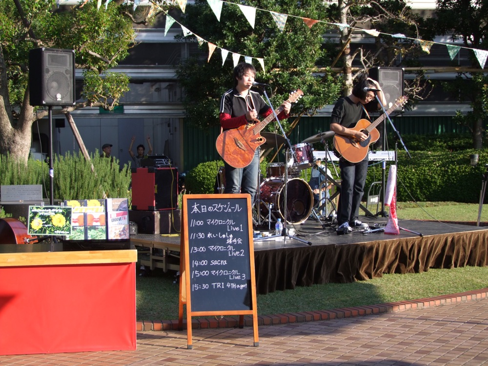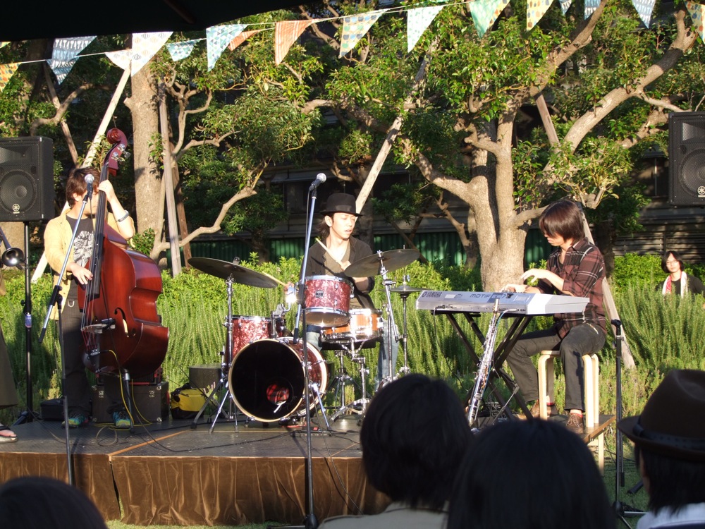 少しバタバタがあって、当初はお昼と午後の2公演だったものの、結局は午後の1公演のみになってしまったり、リハーサルにも時間が掛かってしまったりと、せっかくお越し頂いた方々には迷惑ばかり掛けてしまいましたが、温かい雰囲気の中で、とても楽しくライブに打ち込めた感じがありました。自分達が演奏し始めた時間は、予定の15:30より遅れて、恐らく15:50ぐらいからにはなってしまっていたと思いますが、ちょうど太陽も西日の位置に傾き始めていて、橙色の光の中での演奏は、また特別な感覚ありました。