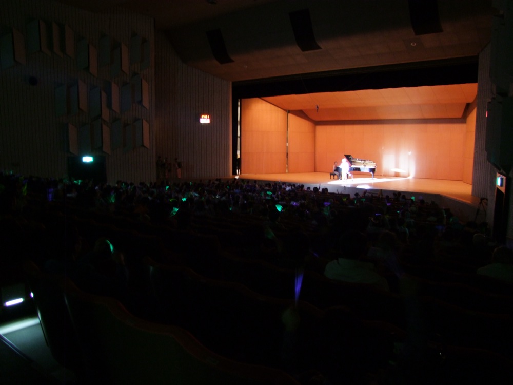 このオリパパの演奏が、プログラム上では最後のステージとなっていたのですが、ここで実はサプライズが仕込んでありました。オリパパには内緒で、事前にお客さん(勿論自分達にも)にケミカルライト(折ると蛍光色に光る棒みたいなもの)を渡していて、アンコール時に客席が暗くなった時に、皆でオリパパに向かってその棒を振る…というものです(右上写真参照)。成功したのかどうかは分かりませんが、一応は驚いてくれたようで良かったです。写真的に、もう少し綺麗に撮れるかと思っていたのですが…(笑)。