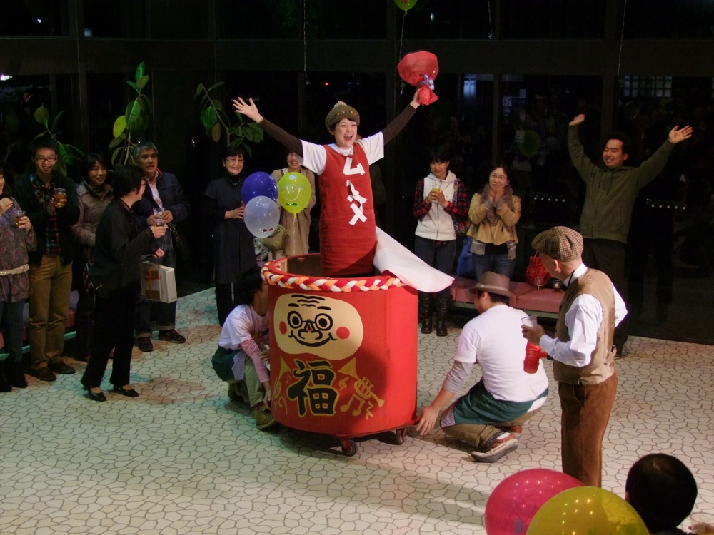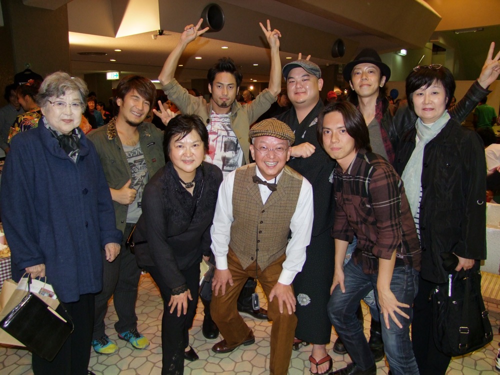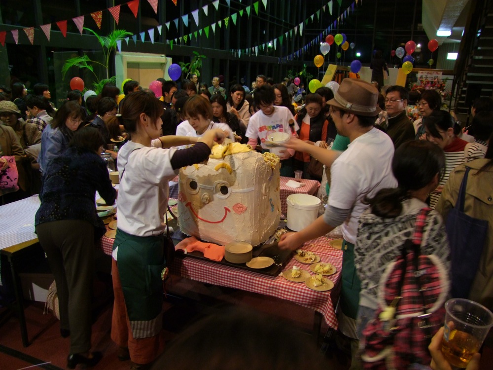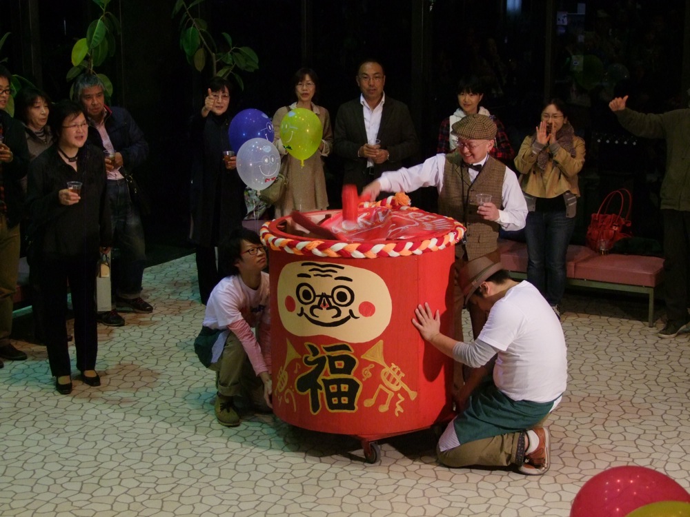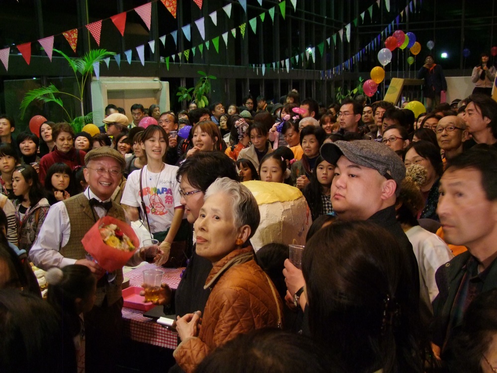 この後はお酒が振る舞われたり、お祝いの樽をオリパパが割ると、中から娘が出てくるという段取りが仕込まれていたり(笑)、オリパパの顔を模ったケーキが出されたり、皆で記念写真を撮ったりと、もう盛り沢山!…オリパパが笑顔になれば、皆が笑顔になる…というように、本当に楽しい会になったと思いました。TRI4TH のメンバーも勿論全員で参加。CDの販売を行いつつも(笑)、楽しいひと時を皆さんと過ごさせて頂きました♪