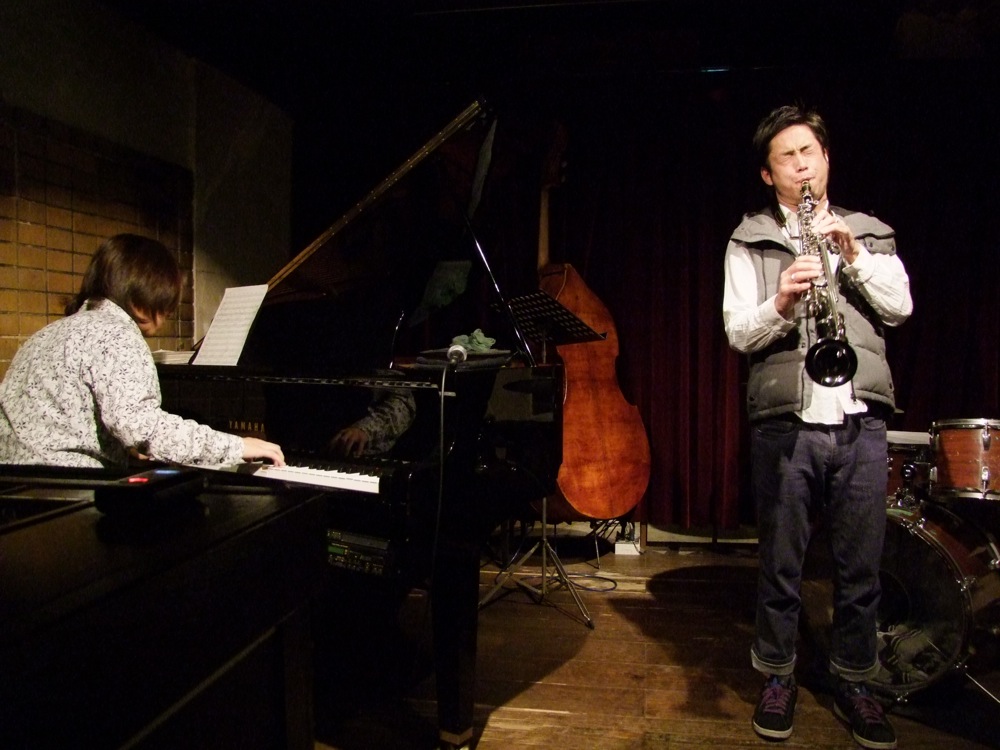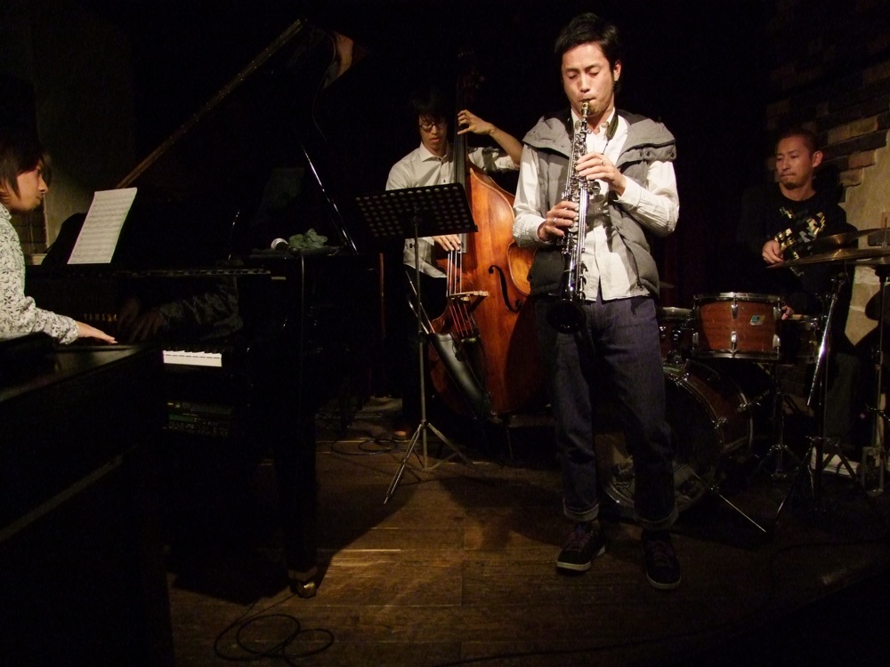 さて、2曲目ですが、ここでゲストとして、この日お店に遊びに来てくれていた、サックスの藤田淳之介君に加わって頂いて演奏していきました。この日の前日に、ライブに行くよ…という話しはしていて、半ば自分はノリで、「じゃあ、サックスも持ってきて貰って」…と言っていたのですが(笑)、ちゃんとその手にはソプラノ・サックスが用意されているではないですか…。そしてステージ上に呼び出し、自分のトリオと TRI4TH の共通の曲目である、自分のオリジナル曲の“New Life Standard”をお送りする事になるのです。この4人で演奏するのはこれが初めてでしたし、藤田君がソプラノ・サックスでこの曲を弾くのも初だったと思うので、これも貴重な時間になりましたね。