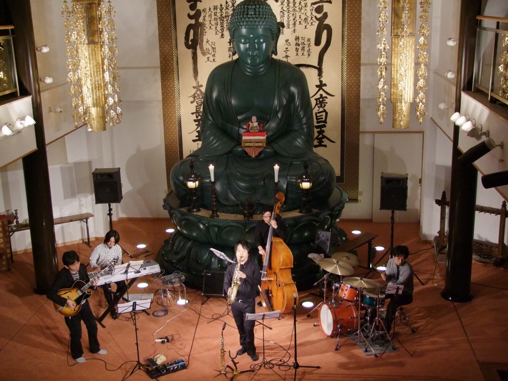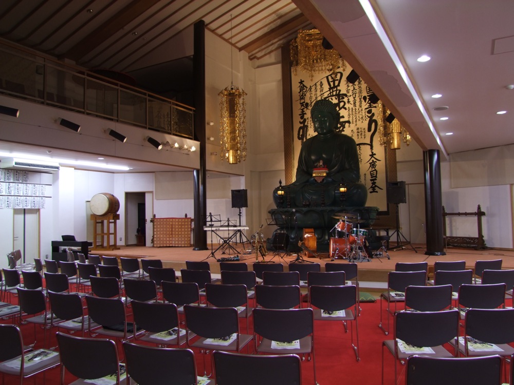 しかし、会場に入ってみてビックリ…。右上写真のような状況で楽器がセッティングされているではありませんか…。確かに、妙常寺という寺での演奏で、そして大仏の前でライブを行う…という話しは事前に聞いていたものの、いざこういう状況に身を置いてみると、なかなか現実を把握出来ない自分がいるものなのですね(笑)。沖縄から移動してきて、何だか環境の変化に付いていけなくなっていたのかもしれませんが、とにかく、気合いを入れて臨みたいライブである事に間違いはありませんでした。今回のライブのメンバーは、今年の7月15日(日)に行われたライブ〔夏の町田 Herbie ライブ!参照〕のメンバーと全く同じで…、と言いますか、この時のライブを見てくれた方が、今回のライブを実現に至らせてくれたという経緯もあったのです。かなりゴリゴリのライブになる事は間違い無い感じでした。