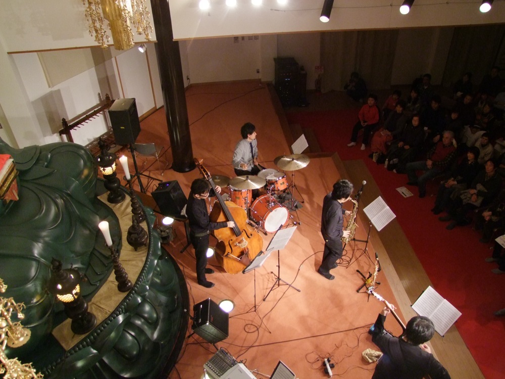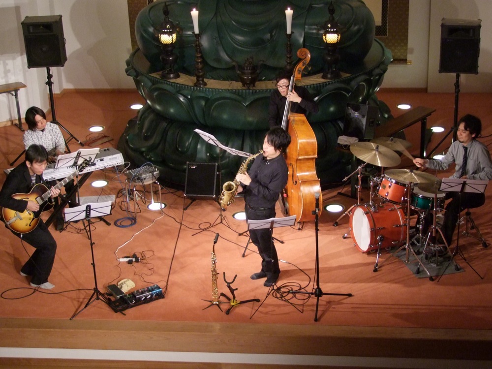 この日は強く雨が降りしきり、そしてこの妙常寺は駅からの交通の便もあまり良くない場所にあったのですが、150名を超えるお客さんにお越し頂きました。日頃からこのお寺が、周りの方々に愛されている証拠でしょう。殆どの方が、ジャズという音楽を普段聴かない方々…との事でしたが、敢えてこの日は“ジャズ三昧”と銘打ったライブとしており、ジャズ初心者のお客さんにもたっぷりと、ジャズの世界に浸かって貰おうと、考えに考え抜かれたステージをお送りしていきました。