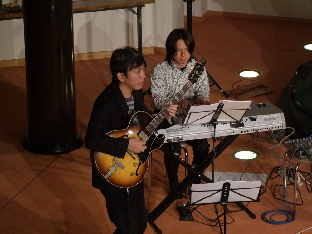 よく、ジャズ初心者の方へ行うライブのやり方として、最初はジャズ・スタンダード曲等の、聞き覚えのある曲をお送りしていき、徐々に現代のジャズに近付けていく…というステージングがありますが、今回は逆に、まずメンバー個人のオリジナル曲をお届けし、徐々にスタンダード等の、耳に優しい曲?に近付けていく曲順を考えてみました。ある意味で斬新でしたが、確かにジャズ初心者の方にとっては、オリジナル曲もスタンダード曲も、どちらも初めて聴く曲に変わりは無いのです。それなら、まず自分達を知って貰う…、つまりオリジナル曲の演奏が相応しいというのも分かる気はしました。お客さんも真剣に聴いてくれていて、良い緊張感の中のライブになったのではないでしょうか。そんな1ステージ目の特記すべきは、ギターの藤井進一君が、この日の為に書き下ろした新曲、その名も“妙常寺”(笑)…だったでしょうか。大曲で、演奏し甲斐のある曲でもありました。