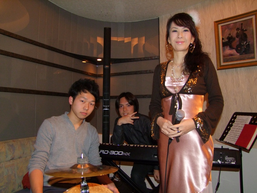 演奏ですが、基本的にはインスト曲を自分とミキヤで担当し、恭子さんが歌う曲では、出来る曲だけミキヤが入る…というスタイルにしていきました。これは、恭子さんが歌う曲でミキヤが知らない曲が沢山あるだろう…という状況を踏まえた上でのスタイルでしたが、実は心配は無用だったのかもしれません…。“ハナミズキ”を知っていたのは勿論の事、“恋人達のクリスマス”も知っていましたし、一緒に演奏はしませんでしたが、“翼の折れたエンジェル”も知っているとの事でした。これなら、すぐにでも歌伴奏の仕事が出来るんじゃないかと思う程でしたが、実際、曲の特徴をよく踏まえた上での演奏を心掛けている感じがしましたし、今後が楽しみなプレイを披露してくれました。インスト曲も、“Caravan”をやったり“Spain”をやったりと、ミキヤには常にその場で曲を与えてのステージを用意してしまいましたが、よく対応してくれたと思います。お陰で、スリル感もありつつ、楽しい時間が過ごせました。どうもお疲れ様でした!