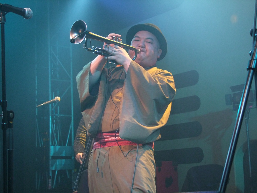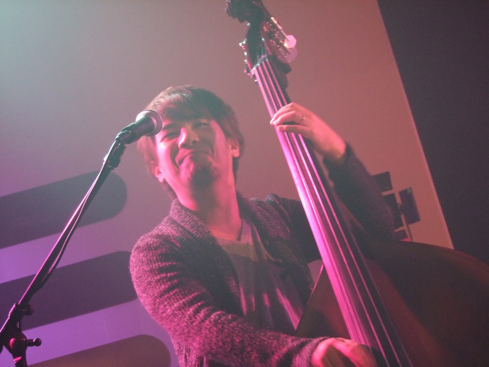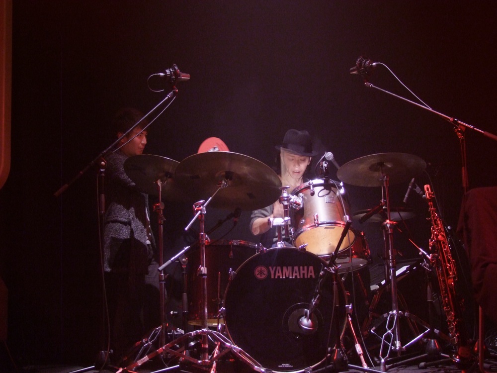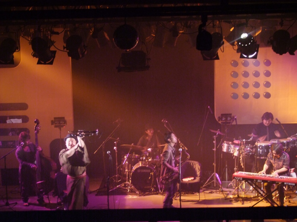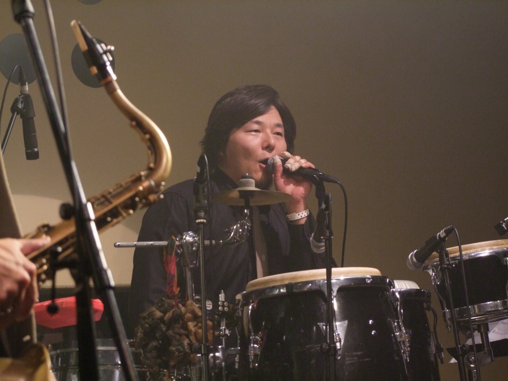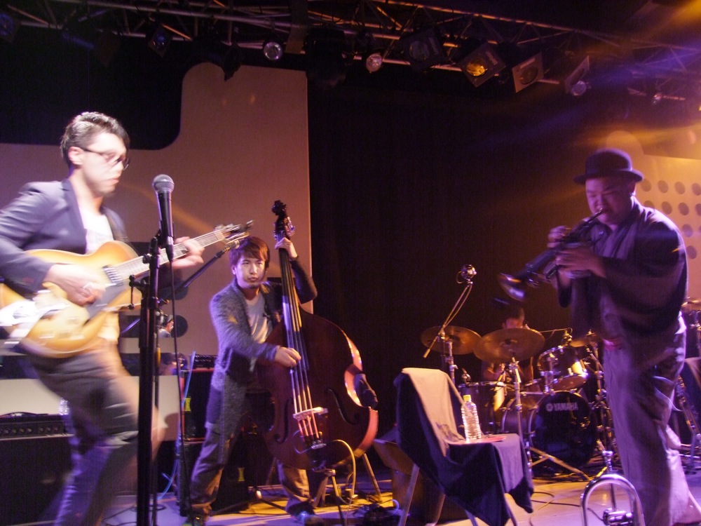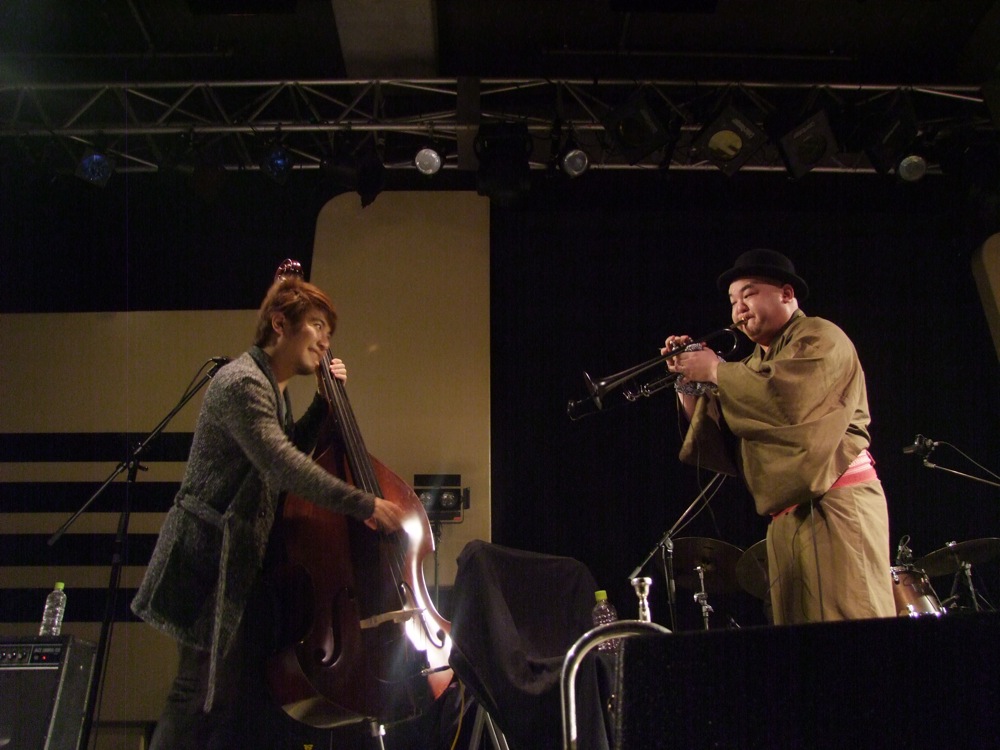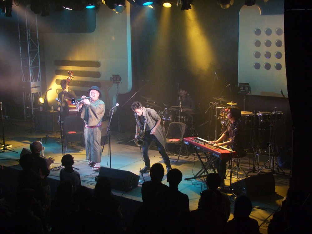 この次には、“ドンパン節”をお送りしました。これは秋田県の民謡なのですが、自分達が全国各地で演奏する時に課題にしているもので、各地の民謡をジャズ・アレンジしてお送りする…というものがあります。例えば札幌に行った際には“ソーラン節”をやりましたし、鳥取に行った際には“貝殻節”という曲をお送りしたりしました。“ドンパン節”は自分がアレンジを担当したのですが、有難い事に好評をもって迎えられまして、今回のセットリストに加わったのでした。原曲のイメージを大切にしつつ、それでいて大胆にジャズ風にアレンジしまして、今回の会場でも好評だったようで良かったです。これら民謡を集めたCDを作るというのも面白そうだなと感じたりしました。