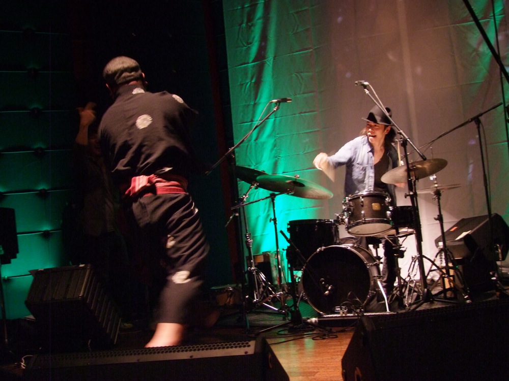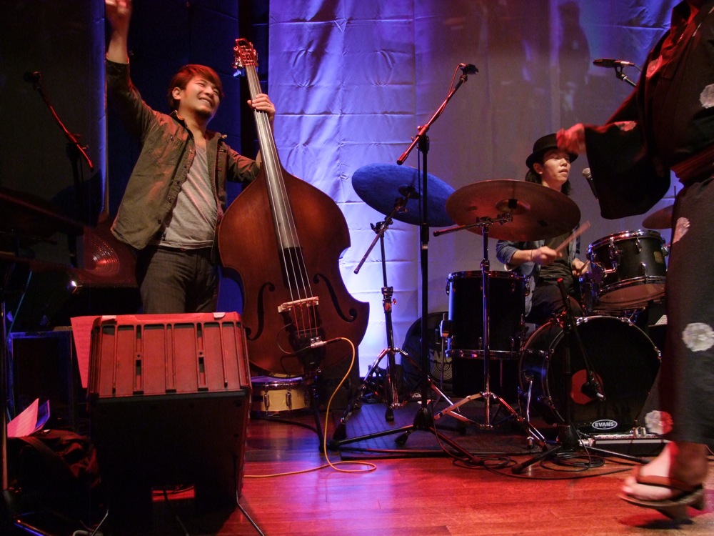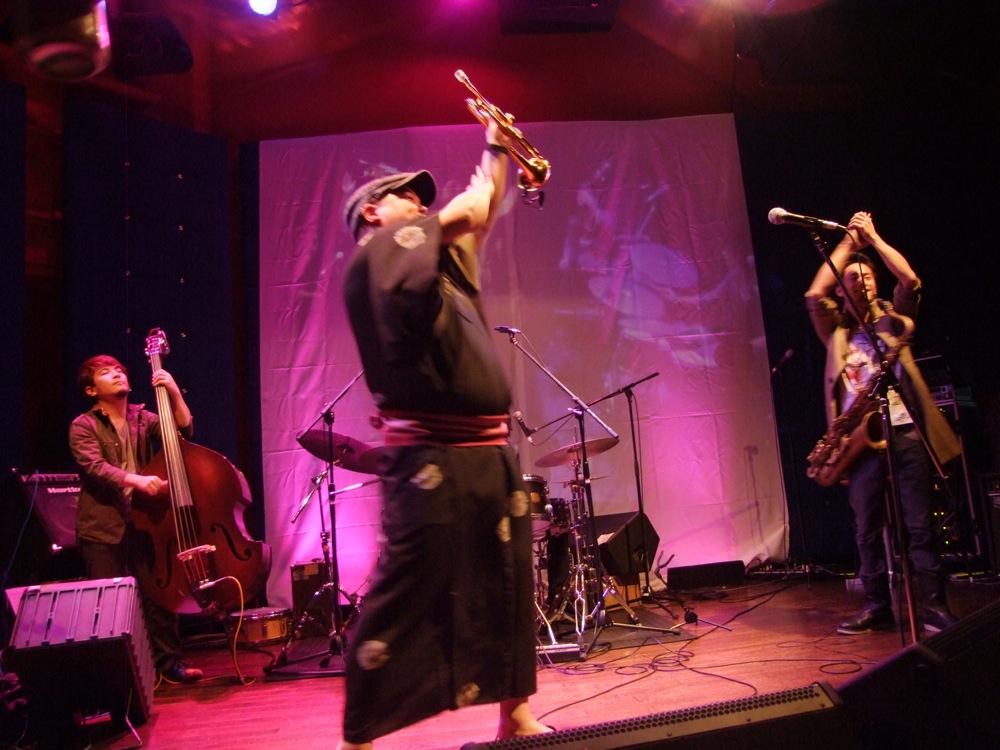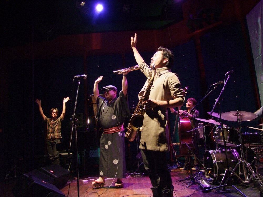 サックスソロ、ピアノソロと続き、本来ならここで短い間奏を挟んでテーマに戻るのですが、ここで偶発的に、ドラムソロへと向かってしまいました。それだけでも迫力ある時間だったのですが、そこに織田君がトランペットソロで絡んでいきます。正にバトルです(笑)!…途中からはドラムの隆郎さんも、立ちスタイルでのドラミングを披露してくれ、迫力に拍車を掛けてきました。注目の時間だったように思います。