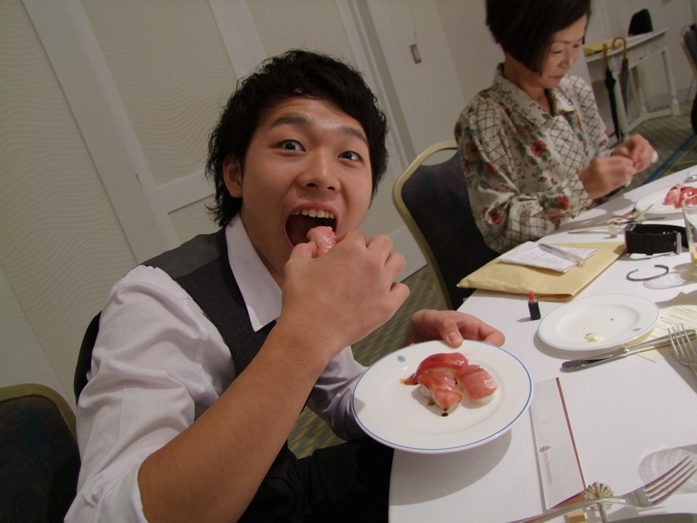 その状況を思わせてくれたのが、ステージ上で行われた、鮪の解体ショーです。恐らく獲れたての、かなり立派な鮪が堂々と祭壇?に上げられ、目の前でどんどん解体されていくではないですか。…そういえば、和歌山県は鮪の産地としても有名でしたが、まさかこんな所で見れるとは思ってもみませんでした。解体された鮪は、ここの会場にいる全員に鮪(トロ含む)寿司として振る舞われ、これがまた美味しかったです。そもそも、この解体ショーが行われる前にも、自分達には一般の方と同じコース料理が用意されていて、既にお腹は満足ではあったのですが、あまりにも美味しくてペロリでした。何だか、この後に演奏する事を忘れてしまいそうです(笑)。