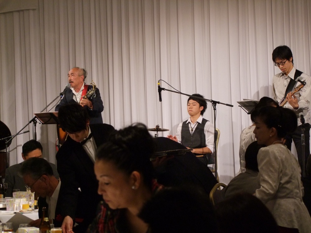 そもそもの演奏時間が短かったので、出来る曲は限られ、しかもそのうち半分以上は、この麗澤会に参加している方が書かれた歌詞の曲や、理事長クラスの方を歌わせるような曲を用意していたので、いつもの伊藤さんのライブとはまた違った雰囲気のものとなりました。ただ、皆さん既にお酒も沢山召し上がっていたのか、反応としては上々で、最後には会場の一体感も生まれていたような気もしました。伊藤さんが、麗澤会の為に作曲した曲も演奏し、これらは御存知の方も多かったという事で、ある意味で和やかな時間にもなったのでしょう。短いながらも、役割を果たせた気持ちが多かったです。喜んで頂けて良かったと思います。
