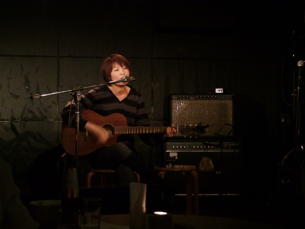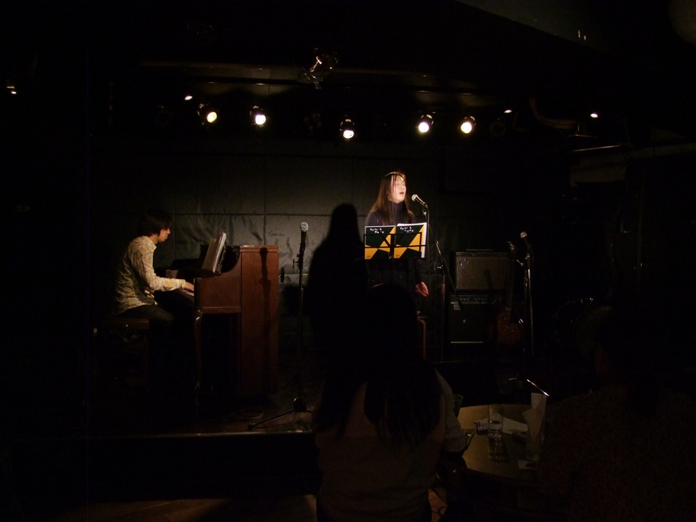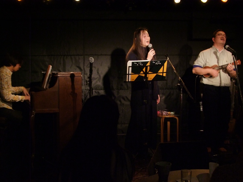 …そして最後の4バンド目として、この日のトリを務めさせて頂いた自分達でしたが、まずは鹿嶋さんのオリジナル曲である“過ぎゆく季節の中で”からお送りしました。オリジナル曲から始めるというのは珍しく、何となく意外な感じもしたのですが、その後にはジャズ・スタンダード曲の“Someone To Watch Over Me”を、鹿嶋さんの日本語訳で披露…と、いつものスタイルでステージを攻めていきます。そして、大事な大事な“ヨイトマケの唄”。必ず鹿嶋さんとのライブでは取り入れている曲で、もう何年も掛けて何度も演奏していますが、今回のは特に良かったような気がしました。素直に曲に感情移入出来たというか、ダイレクトに音楽と会話出来たような時間が過ごせたように思ったのです。何度も演奏しているので、基本的にリハーサルは行わないで本番に挑む事の多いこの曲ですが、それが今回は吉と出た結果でしょう。