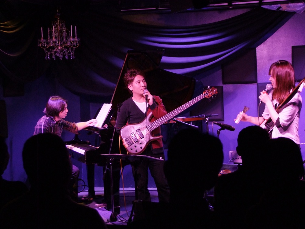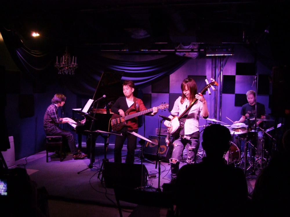 では今回のコンセプトは…というと、津軽三味線奏者のはなわちえさんをメインとし、ジャズを演奏する…というものでした。はなわさんはジャズの奏者ではありませんが、その三味線演奏の実力は折り紙付きで、アドリブも軽々と熟してしまいます。そして自分のピアノトリオの代表として…というわけではありませんが(笑)、自分とドラムの佐々木俊之さんがそれに加わり、リーダーの関谷君とでリズムを固め、この4人編成で、それぞれのソロ演奏を主体としたライブを今回はお送りしたのでした。