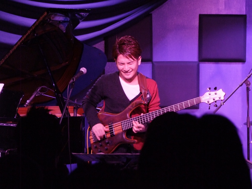 演奏は2ステージに分かれ、関谷君のオリジナル曲を中心にお送りしていきました。関谷君のオリジナル曲は、一緒に参加している TRI4TH でも経験済みですが、こちらは更に関谷君の魅力が凝縮されたと言いますか(笑)、より濃い部分が曲を通して見えてくる感じがしました。上の写真を見ても分かると思いますが、関谷君の立ち位置が本来のベーシストの立ち位置より、かなり前に出てきているのが確認出来ると思います(笑)。やはり、ベーシストがリーダーのライブなのでしょう…。そして見た目もそうですが、演奏的にもそうで、関谷君のプレイをやはり前に出しつつ、自分達もしっかりと表現させて貰っている…。そんな状況が心地良い時間だったように思うのです。この事は、リハーサル時から関谷君が言っていた、「皆さん、好きなだけソロをとって、好きなだけ目立って下さい!」と言っていた事と重なる気がします。正に、関谷君の人柄がそのまま出ていたライブだったとも言え、そんなライブに皆さんが足を運んでいて…、心地良くない筈がありません。良いライブだったと思います。