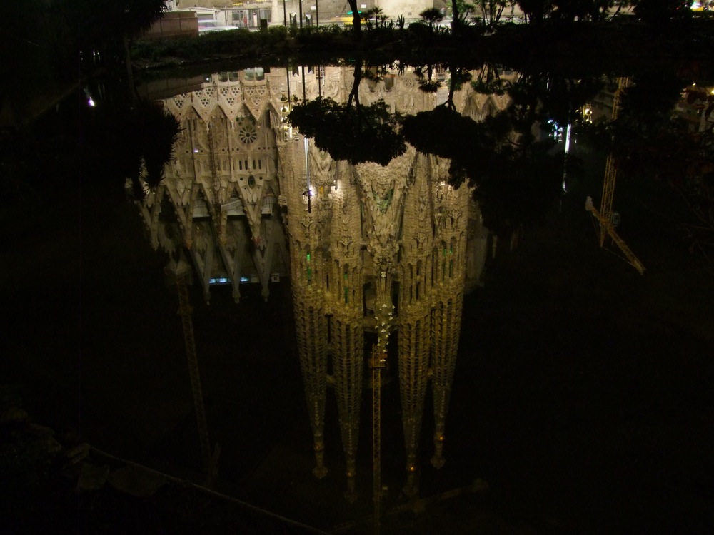 サグラダ・ファミリアの北東側の隣りのブロックに、ちょっとした公園があり、そこに小さな池があるのは御存知でしょうか。サグラダ・ファミリアを写真に収めるには、ある程度の距離をとらないと全体が入らないので、その池を挟んで撮る場合が多いのですが、最初に来た時は何気なく見ていたものの、暫くその場所にいると、風が全く無くなかったのか、池の水面にハッキリとその建物の姿が映っていたのです。