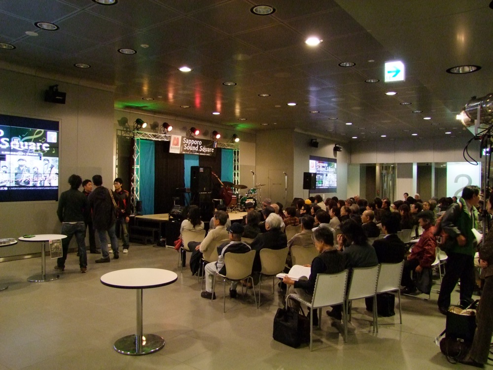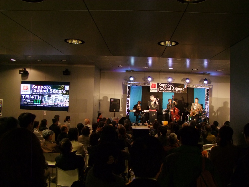 最初はお客さんも緊張している感じでしたが、1曲、また1曲と終わる毎に解れてきた感じもあったのでしょうか…。手拍子を促して、皆でノッてくれる等、嬉しい場面も多々あり、そして札幌の人達の温かさを随所に感じられるステージになってきたのです。ソロ演奏への拍手もまた嬉しく、本当に耳を傾けて聴いてくれている感じが伝わってきました。そして、客席はほぼ満席となっていましたが、その後ろにはすぐ一般の通路が控えていて、この辺りを歩いている方々も足を止めて、こちらのスペースに近付いてきて頂けた方も多かったように思います。時間にしては約30分と、短いステージではありましたが、夜に行うライブの宣伝もしっかりと行い、自分達の時間は終了させて頂きました。勿論、その後にはCD販売も行いまして、多くの方に御購入頂きました。何とか TRI4TH というバンドの足跡は残せたように思います。夜の演奏への気分高揚も、ますます高くなってくる感じでしたね。