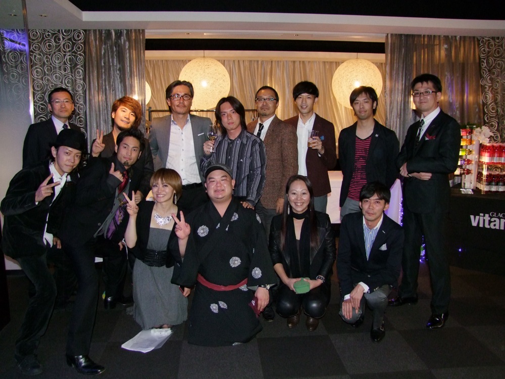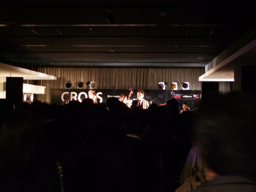 会場はもう別世界でした。そもそも、シックな感じでまとめられている場所なのですが、更にそのダーク感が強まったというか、照明等も極力限られたものにしており、そして空間の脇にはカウンターが並びます。更に、そこを埋め尽くす、人、人、人…。これは凄いです…。実は今回のイベントにはドレス・コードが設定されていて、例えばジーンズ等は不可なのですが、来る人は皆、ビシッと決まっていて、それもまた今回のイベントのスタイリッシュな部分を引き立てているかのようです。自分達の衣装も普段とは異なり(あ、1人だけはそのままでしたが…笑)、皆で久し振りにフォーマル姿で登場していきます。そしていきなりの歓声を受け、嬉しさ半分、驚き半分…(笑)、いや、素直に嬉しいですよね。…それでは自分達の音楽をお送りしようではありませんか。