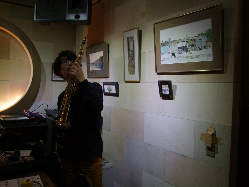 このお店での演奏というのは本当に独特で、全てが生音でお送りしている…という状況もあるのかもしれませんが、グランドピアノを客席の机が囲んでいるという、珍しい形態での演奏環境がここにはあり、そこで生身のサックスと自分との、2人だけの世界を作らなければいけないというのが、生楽器ならではの臨場感ある状況を作り出しているのでしょう。非常にストイックな場でもあり、それでいて、自由度の高い場所でもありました。デュオという演奏形態において、色々と成長させられたお店かもしれません。