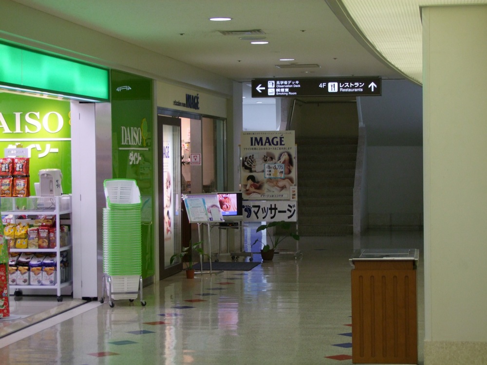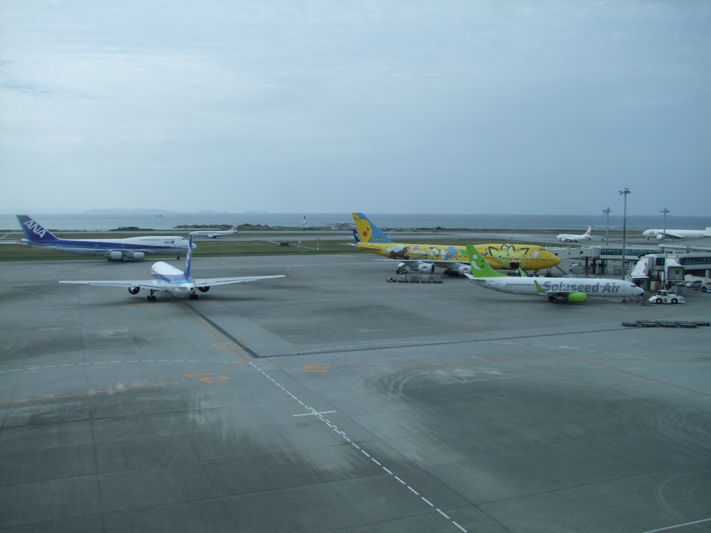 この便は、披露宴演奏が決まってからすぐに予約してくれたもので、当時はまだツアー自体のスケジュールが定まっていなかった事もあり(披露宴演奏は2日目に行われました)、那覇空港に11:30ぐらいには着いてしまうという、いつものツアーからすると結構早い時間のフライトでもありました。この日はお馴染みの北谷 Mod's でライブが予定されていたのですが、17:30ぐらいに入れば良いという通常のスケジュールからすると、結構時間がある事になってしまいます。そして実は、今回のツアーの沖縄本島での移動はレンタカーを使う事にしていました。確かに、北谷、恩納村、平敷屋、そして再度那覇と、移動しては泊まり、移動しては泊まり…の状態が続くので、これは賢明な移動手段だとは思いますが、肝心の西仲さんが運転出来ないので(笑)、運転担当は自分にならざるを得ないという事になります。…それは別に良いとしまして(笑)、レンタカーは結構安いプランが沖縄には存在しており、3日間(72時間)で約6500円!というキャンペーン価格で申し込んでいたのですが、返却時刻を、那覇に戻って来る3日後の14:30と設定していた(この日のホテルのチェックイン時間が15:00だったのです)ので、当然の如く、借りる時間も14:30…。空港で自分は3時間近くも過ごさなければならなかったのです。勿論、これは当初から合意の上で、空港で時間を潰すのは得意なので(笑)大丈夫だと思っていたのですが、お酒を飲んではいけないという事実に気付いてしまい、食事系で過ごすのが厳しくなってきてしまいました(笑)。…という事で行ったのが、飛行機ウォッチングとマッサージ(笑)。意外と癒しの時間を過ごせました♪