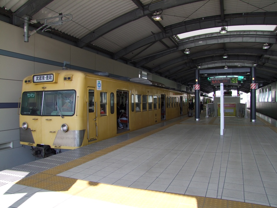 以前はJR中央線の下りホームと同じホームから出ていた多摩川線でしたが、中央線が高架化するのに伴い、多摩川線も一体的に高架化になりまして、最近完成(中央線の方は、まだ工事中という感じです)。今では完全に独立したスペースが与えられていて、中間改札も設けられていました。高架化に伴って駅の近代化もされていましたが、この多摩川線という路線は、西武鉄道の中でも一番経年の高い車両を使わされるのが常でして、ホームには101系という、西武本線では既に見られなくなった車両が停車していました。この車両も、自分にとっては久しぶりな感じがしてしまいます。