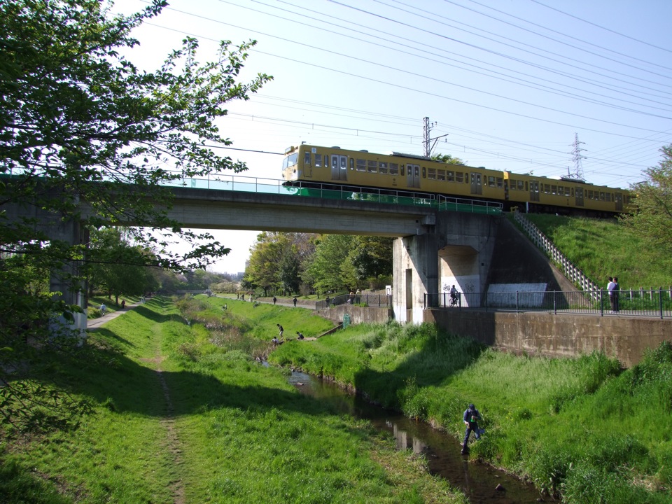 前述のように、この駅の近くには多磨霊園があって、それに近接して野川公園、武蔵野公園があり、列車はその間を通っていくように線路が敷かれているので、この区間は多摩川線の中でも屈指の?風光明瞭なポイントだったりします(笑)。この日は休日という事もあって、公園では家族連れの姿が目立ち、運動公園では学生達がスポーツに興じている等、何だかほのぼのとした光景でしたね。そして、そこを通る多摩川線…。正に、町に溶け込んでいる瞬間だと思ったものです。