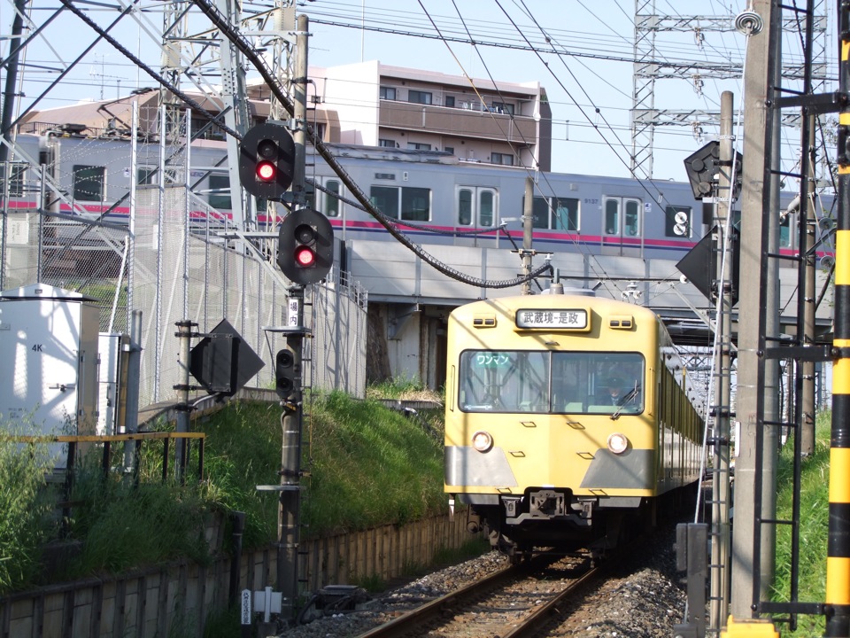 この白糸台駅には車庫が併設されており、この時は旧101系が1編成だけ休んでいる状態でした。…という事は、多摩川線で昼間時に起点から終点まで乗り通すと、2回、他の列車と擦れ違う事になるので、常に3編成が稼働していて、あとの1編成は予備車扱い…という事になるのでしょうね。このように路線距離が短いと、車両の使われ方も分かりやすいので、自分としては面白いです。恐らく、今のところ1編成しかない新101系が使われない日というのも、あるのだと思いますし…。これも、鉄道さんぽだからこそ取り上げる事柄なのですよ(笑)。