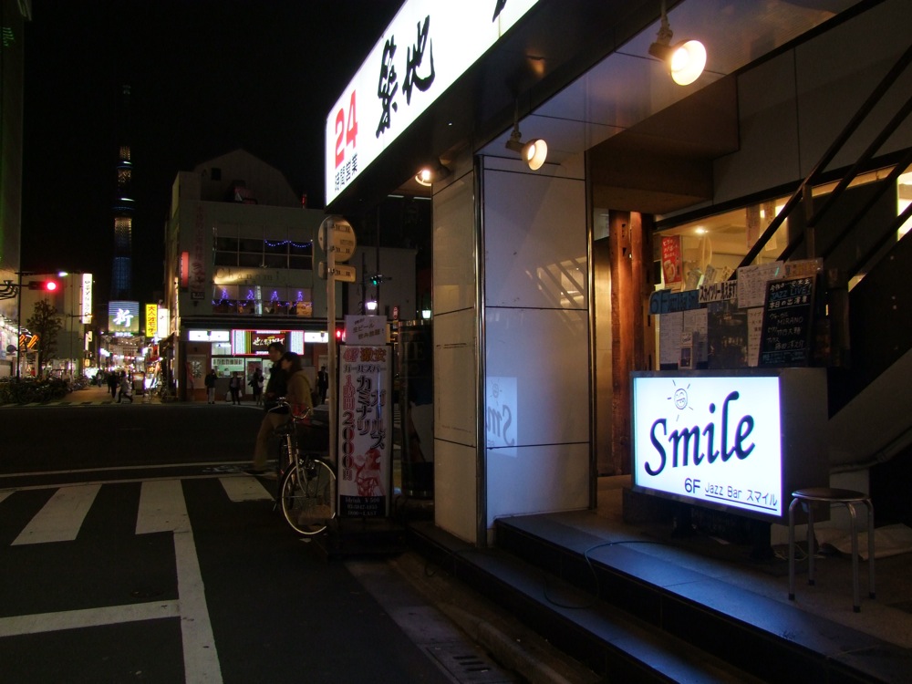 …と、この Smile というお店ですが、何だか自分は前にも来た事があるような感覚を憶えていました。気になったので調べてみると、確かにそうでした。時は2006年11月、Smile が開店する以前、Balloon という名前でお店が営業していた際に、自分は演奏しに来た事があったのでした〔竹内大輔の写真日記(~2009)、浅草 Balloon は、本当に Balloon だった参照〕。あの時は確か、窓はあまり無かった気がするので、やはり東京スカイツリーが完成した時に改装したのかもしれません。記憶が正しかったようで、少し懐かしくも思えて良かったです(笑)。