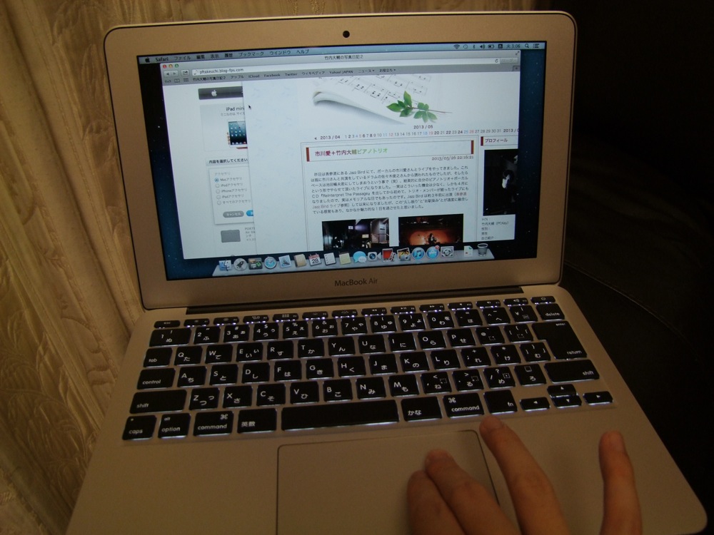 既に自宅も無線 LAN 仕様にしたので、これで非常に快適なネット生活が送れる筈です。…とは言え、自宅にはデスクトップPCもありますので(こちらは Windows なのです)、やはり外出した時、特にこれからは地方ツアーに行く際に威力を発揮していきたいものです。動作は本当にサクサク動いてくれて気持ち良く、まだ購入してから1日しか経っていませんが、そこから以前の MacBook を使った時に、もう動作が鈍く感じてしまう程でした(笑)。