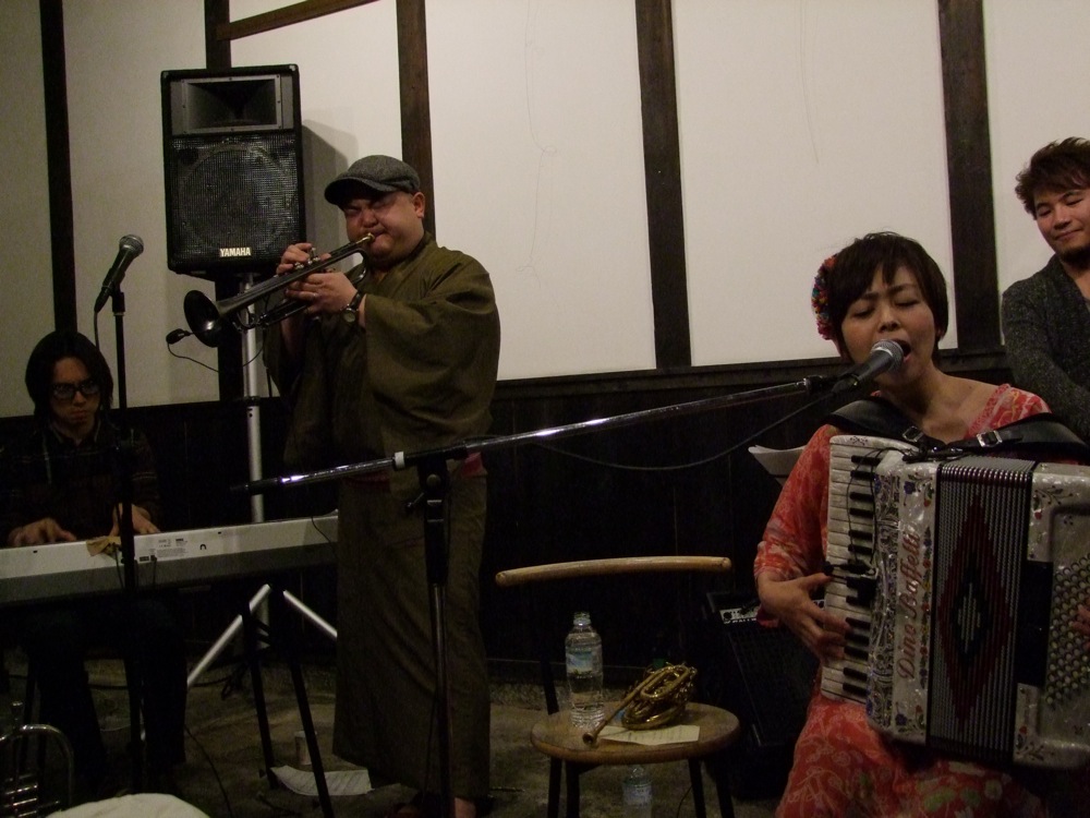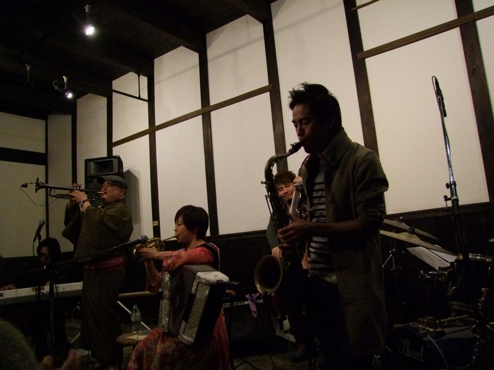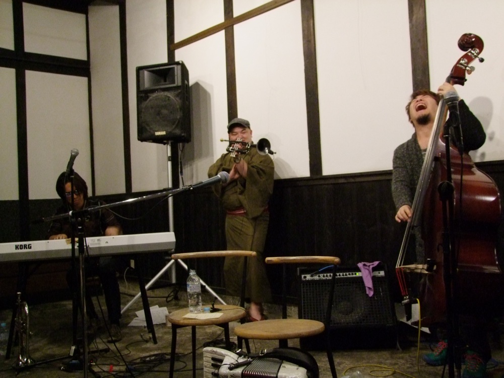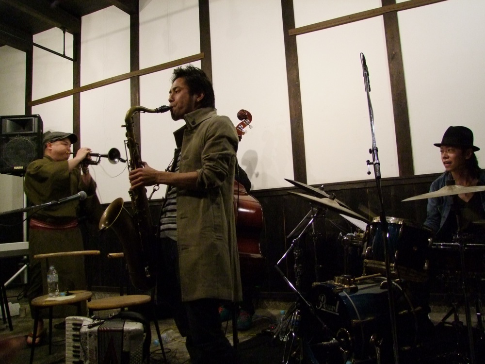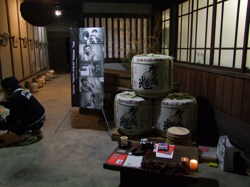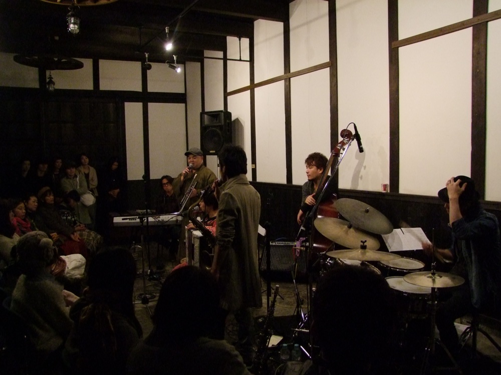 これで身体も温まってきます(笑)。写真の通り、今回のステージは本当に蔵の中で行われているのですが、音の回りが良い意味で独特という感じがありまして、演奏する側としても聞こえ方的に、それに見合った演奏を行おうとするのです。それが音として表れた時は面白いもので、そこから派生する音と音との掛け合いも見所の1つになっていたかもしれません。