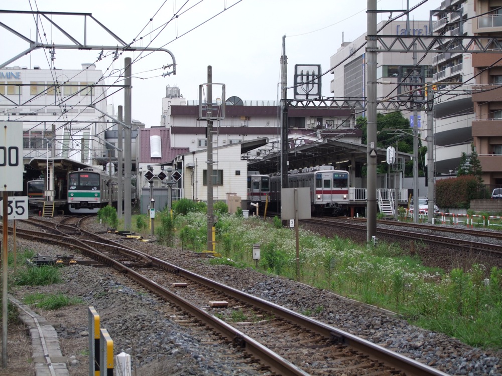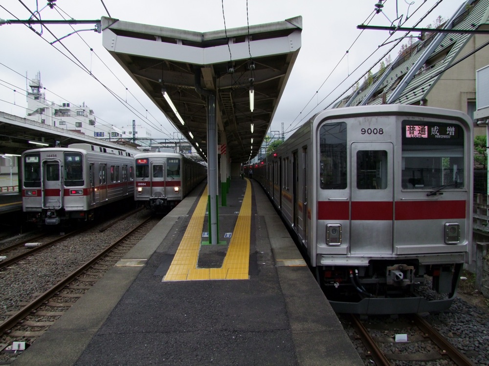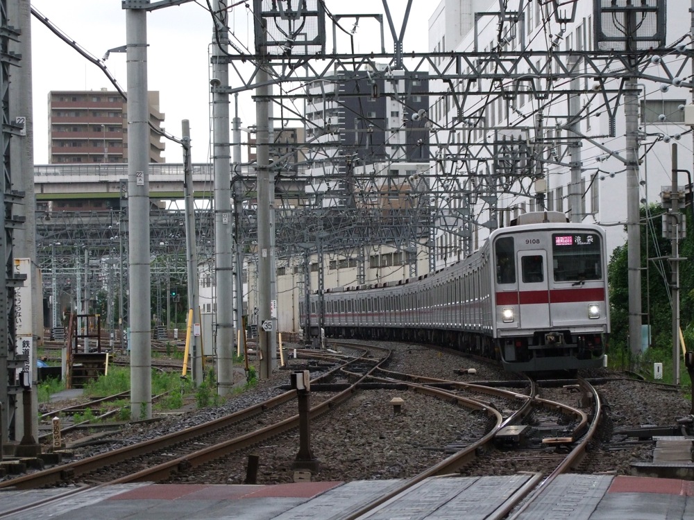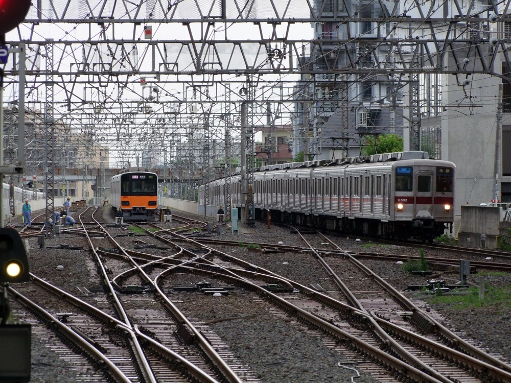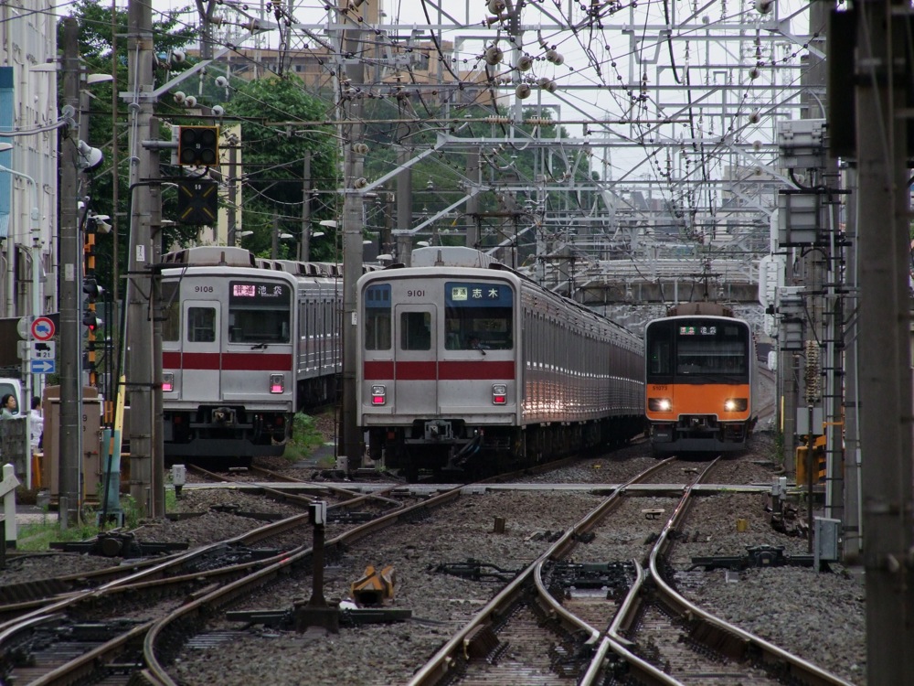 さて、成増駅留置線を写した上のが挙げたところで、東上線車両についても徐々に説明しておきましょう。左上写真には同じ種類の車両が2本見えますが、これは9000系という車両で、東京メトロ有楽町線直通用として開発された車両です。そして時代は過ぎ、副都心線対応が必要になってきますが、ここで試作車の1編成を除いて、そのリニューアルが施されました。その対応型が左の車両で、真ん中に走っている車両こそ、1編成のみの試作車なのです。何故試作車には対応が施されなかったかというと、製造が6年も異なる事(試作車が1981年、量産車は1987年)と、それに伴う寸法の違い(副都心線にはホームドアが設置されていて、ドア間の寸法が試作車では異なります)や、走行装置の違い等が大きな理由かと思われます。故に、試作車は現在は地下鉄には乗り入れておらず、地上線専用の運用となっています(量産車は主に地下鉄に乗り入れますが、運用によっては地上線に入る事もあり、左上写真のような共演も見られるのです)。
