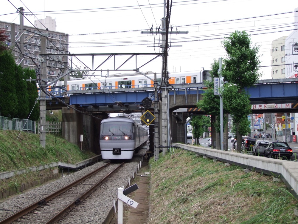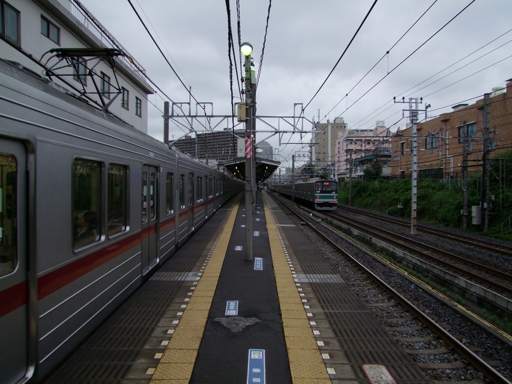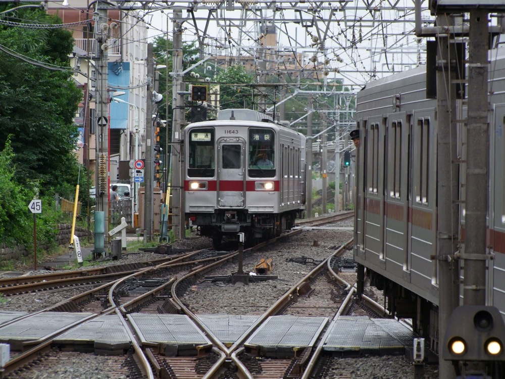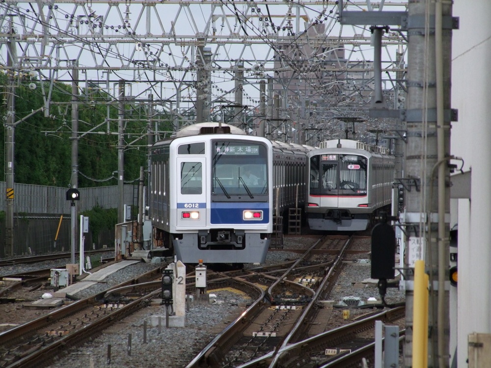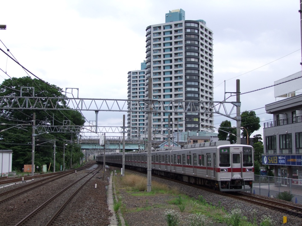 さて、成増駅留置線を写した上のが挙げたところで、東上線車両についても徐々に説明しておきましょう。左上写真には同じ種類の車両が2本見えますが、これは9000系という車両で、東京メトロ有楽町線直通用として開発された車両です。そして時代は過ぎ、副都心線対応が必要になってきますが、ここで試作車の1編成を除いて、そのリニューアルが施されました。その対応型が左の車両で、真ん中に走っている車両こそ、1編成のみの試作車なのです。何故試作車には対応が施されなかったかというと、製造が6年も異なる事(試作車が1981年、量産車は1987年)と、それに伴う寸法の違い(副都心線にはホームドアが設置されていて、ドア間の寸法が試作車では異なります)や、走行装置の違い等が大きな理由かと思われます。故に、試作車は現在は地下鉄には乗り入れておらず、地上線専用の運用となっています(量産車は主に地下鉄に乗り入れますが、運用によっては地上線に入る事もあり、左上写真のような共演も見られるのです)。