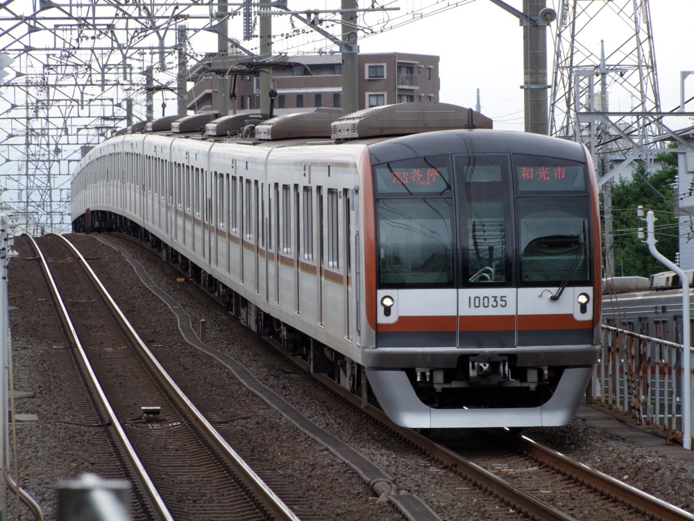 少々話しが逸れましたが、和光市駅では色々な鉄道会社の車両を見る事が出来ます。その中でも特筆したいのは、やはり西武鉄道と東急電鉄の車両でしょう。遠く離れた東武鉄道管轄内で、その2社の共演(右上写真参照)が見られるというのは、相互直通のスケールの大きさを感じさせるというものです…(笑)。当然、東京メトロの車両も見られますし、みなとみらい線の車両も見られますので、和光市駅は非常にバラエティに富んだ車両が見られる駅ともなっています。この内、西武鉄道の車両以外は、東上線内にも乗り入れてきますが、前述の通り、日中は1時間に有楽町線からの車両が2本、副都心線からの車両が2本(副都心線内は急行運転)だけの直通となっているので、全て10両編成となっている事から、8両編成の車両(故に、みなとみらい線の車両は全部)は日中では見る事は出来ず、しかも8両編成の乗り入れは最大でも志木駅までとなっています。