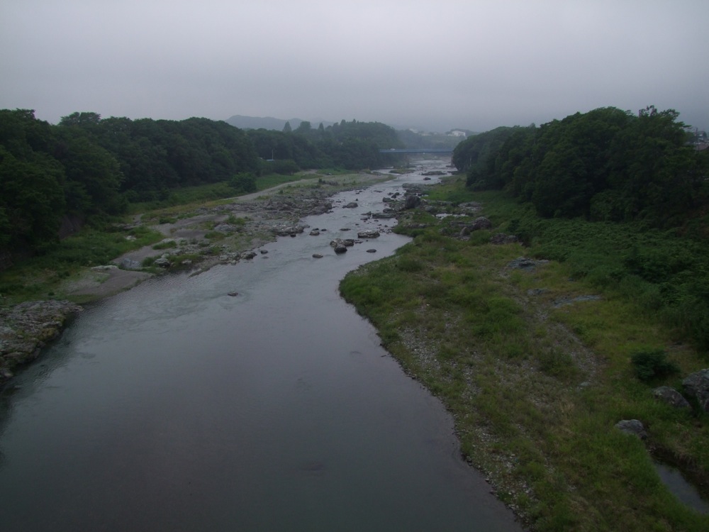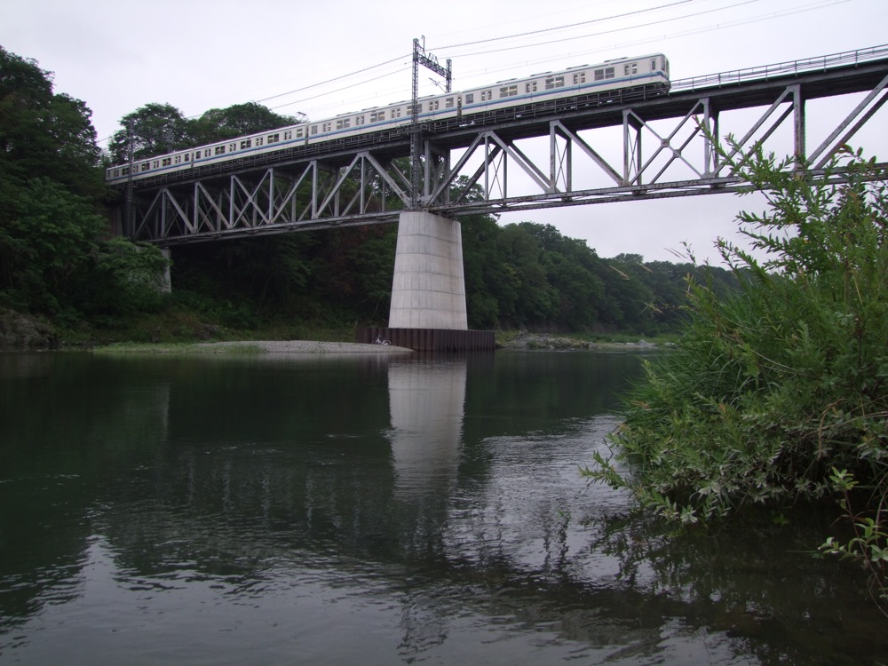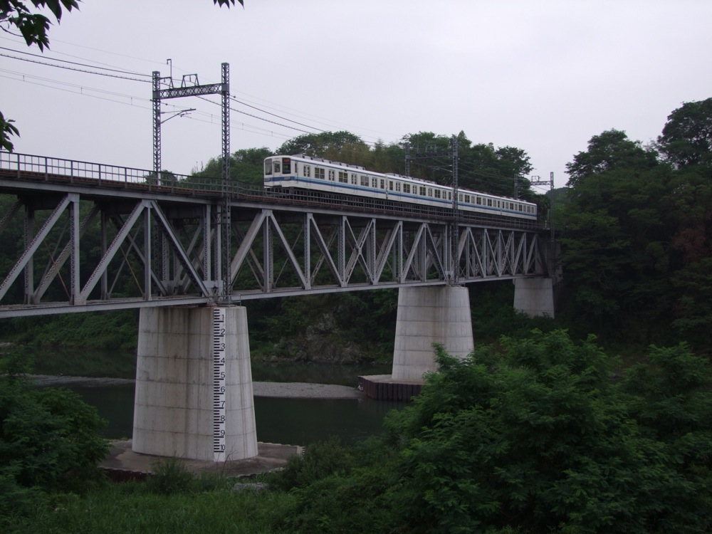 そして寄居町に入り、鉢形駅を過ぎると荒川橋梁を渡ります。ここの眺めは素晴らしく、恐らく東上線の中で最もハイライトな区間と言って良いでしょう。荒川というと、金八先生でお馴染みの、あの雄大な川というイメージが浮かびますが(笑)、上流に近いここでの荒川は、岩肌もゴツゴツしていて、何だか厳しい自然を思わせる雰囲気が漂っています。