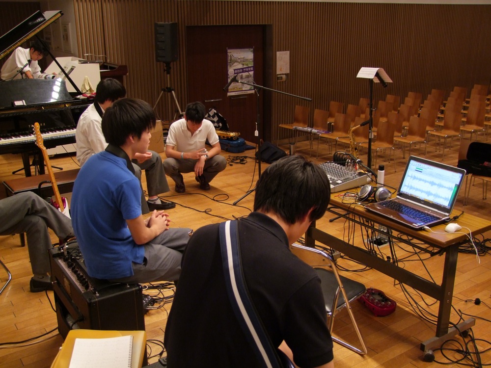 …ところで、この録音というのが意外に本格的で、校内の軽音楽部からマイクやらPA機材等を借りてきて、それぞれの楽器にマイクを立て、ちゃんとラインでも録り、それをパソコン上でモニターしながら等々、現在の自分達でも行うレコーディングさながらの作業が行われていたのでした。勿論、こうしたレコーディングは経験の無い生徒達ばかりですので(当たり前です)、自分も出来るだけサポートをしましたが、当然の事ながら、試行錯誤しながらの時間ではありました。それでも、色々とバランスを変える度に音が良くなってくる傾向はあったので、徐々に皆も手応えが感じられてきていたと思います。