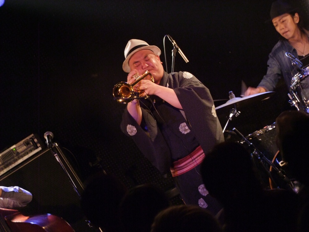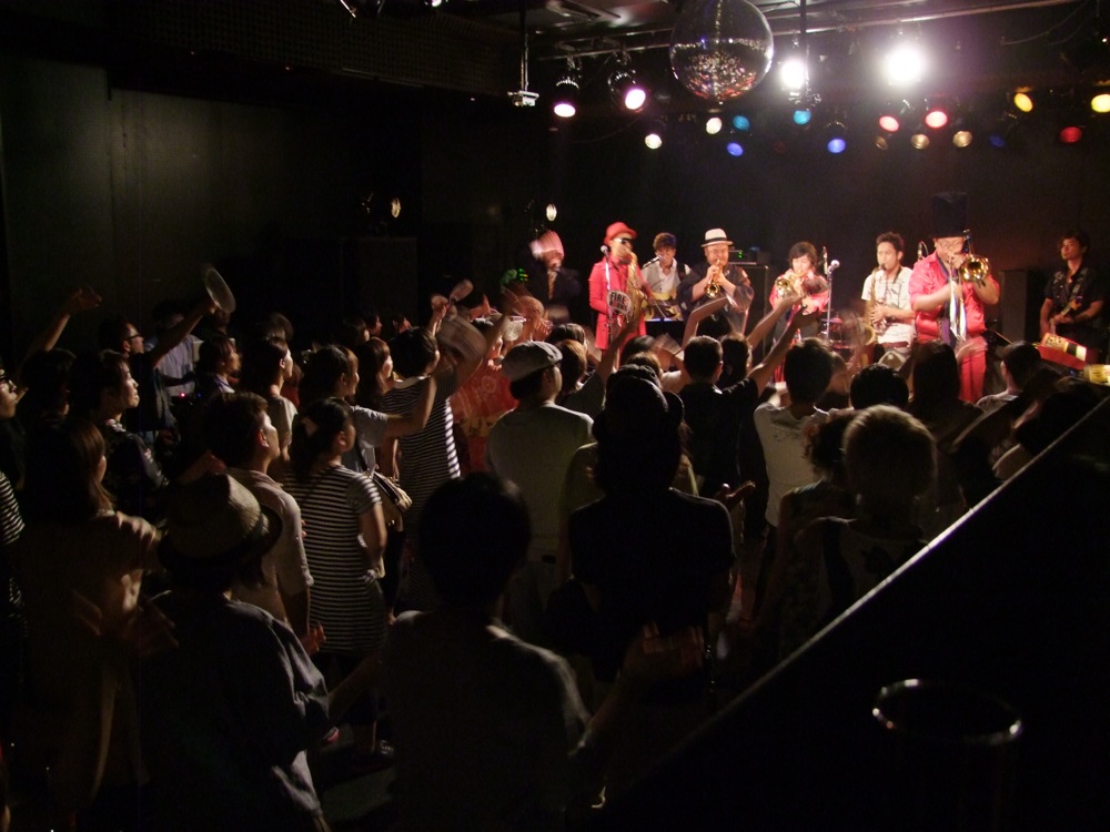 夏…を感じる要因として、浴衣を着てお越し頂いたお客さんには1000円オフになる…というのも大きかったかもしれません(…ちなみに、FIRE HORNS のカラーである、赤い服を着た方も1000円オフ、そして赤い浴衣を着てお越しになった方は2000円オフ!…という事にもなっていました)。浴衣でお越しになった方は何人かいらっしゃっていて、夏らしい会場が展開されていたのでした。