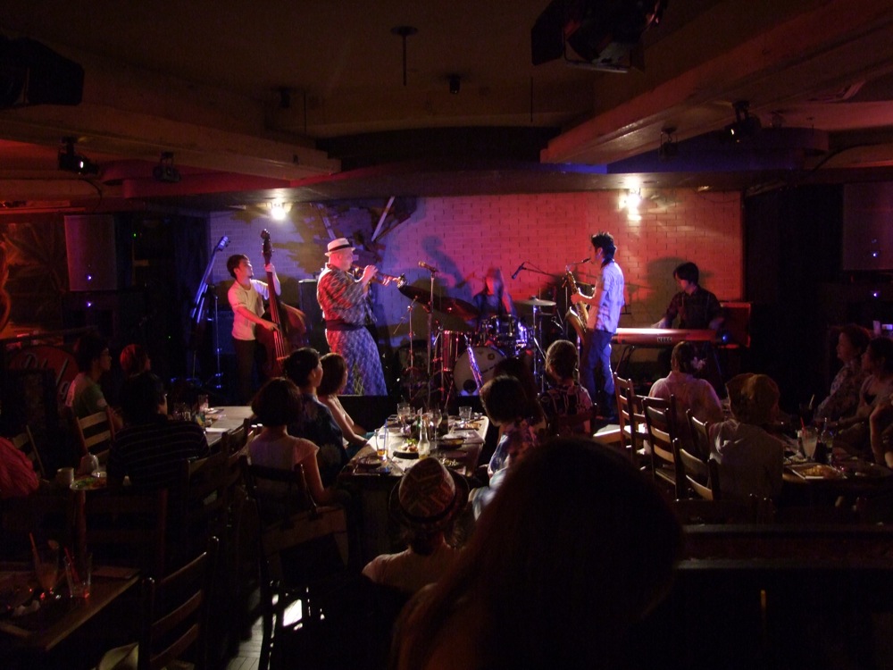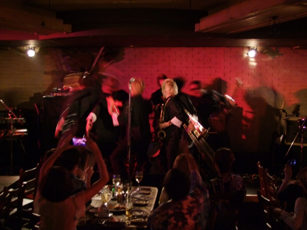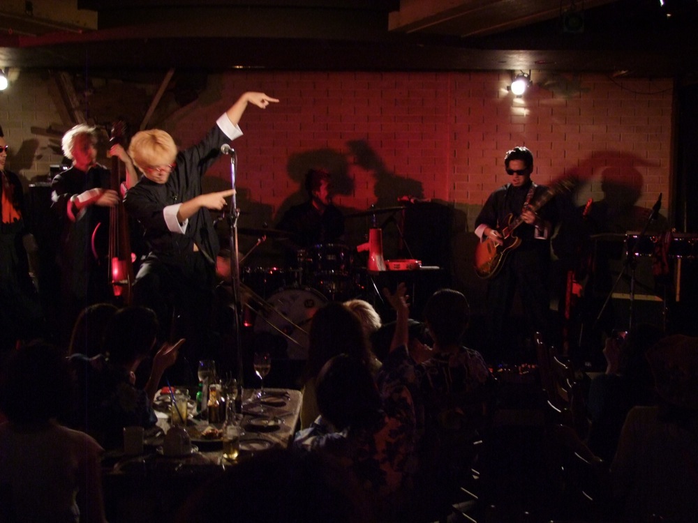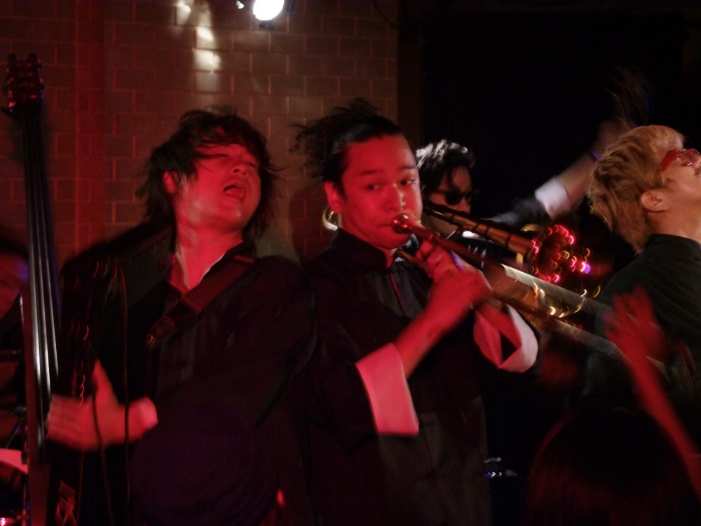 さて、そんなカルメラも8人所帯と、どちらかと言うと大所帯のバンド…。今回もきっと皆をワクワクさせ、楽しませるに違いありません。…と思って登場を待ってみると、突然、店内にはブルース・リーの“燃えよドラゴン”が流れ始め、どこからか「アチョー」という声が上がったかと思えば(笑)、黒いカンフー・スーツに包まれたカルメラ・メンバーが勢い良くステージに上がってくるではないですか。そしてカンフーの型を披露し、演奏に突入していくのです。…流石としか言いようがありません(笑)。