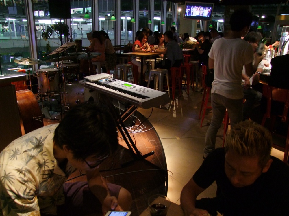 お店は自分は初めて来ましたが、ドラムの佐々木俊之さんは何度かお客として来店した事があるとの事(流石です…笑)。エンターテイメントとの空間…とは正にその通りで、昼はカフェ、夕方以降はパブ、そして夜遅くなるとクラブっぽい雰囲気にその姿を変えていくとの事…。自分達が演奏する時間帯は、正にこのクラブっぽい雰囲気になる時で、ステージには DJ ブースが作られ、お洒落でモダンなスタイルが提供されていました。初め、カフェでの演奏…という事で、普段ですと音量に気にしながら演奏しなければならなかったりするのですが(笑)、DJ の音量を聴く限り、かなりガッツリと演奏して良さそうです。何だか気合いが入る瞬間でもありました。