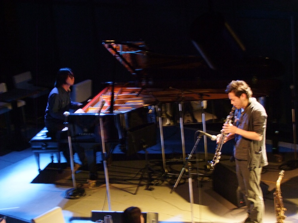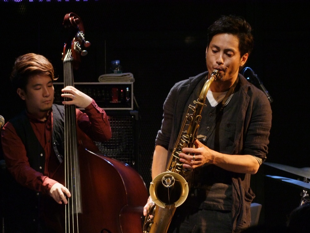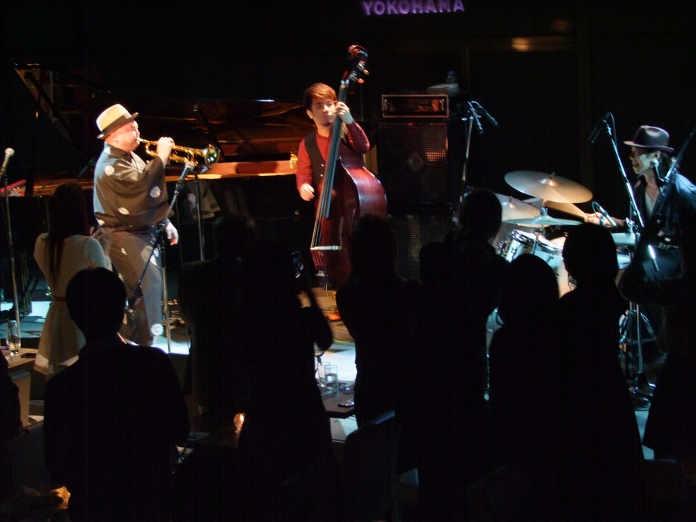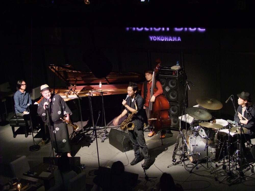 2ステージ目は、楽器編成的にも変化のあるステージでした。その1曲目には、「ジャズに強く陶酔した…」的な意味を持たせた造語の“Jazzholic”という曲をお送りしましたが、まずベースの関谷君が1人でステージに立ち、ソロベースを唸らせます。その後、ドラムのタカオさんが加わり、軽快なジャズ・ワルツを叩き出します。そして自分も加わってピアノでハーモニーを鳴らしつつ、サックスの藤田君が、その上で自由なソロを吹き出しました。そうしてトランペットの織田君が加わり、曲のメロディへと突入させたのです。