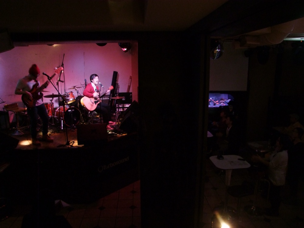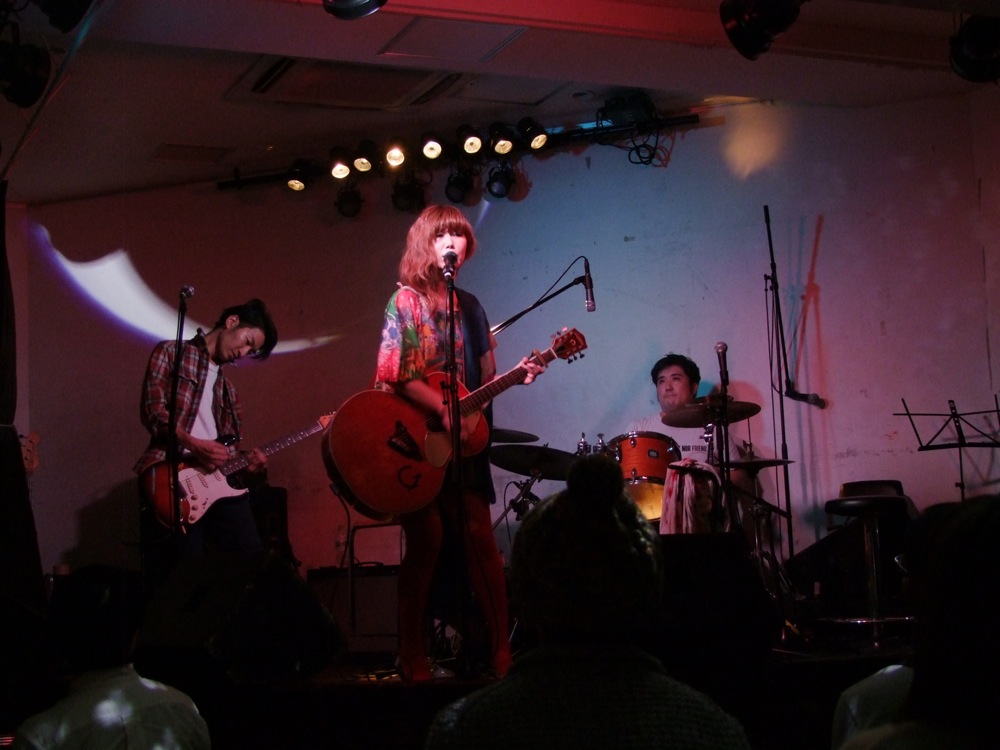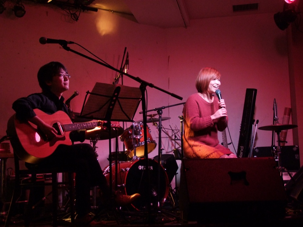 この日は本番前から、会場は既に“打ち上げ”状態でした(笑)。Under Deer 名物?のお酒、イエーガーマイスターが出演者に振る舞われ、まずは一気に景気付けです♪…そして、久し振りのオープニング・アキコ(彬子さん自身がオープニング・アクトを務めるというもの…ステージの半分以上はトーク…笑)の登場となり、ギターの寺岡とのデュオ編成で、イベントの幕を開ける事になりました。