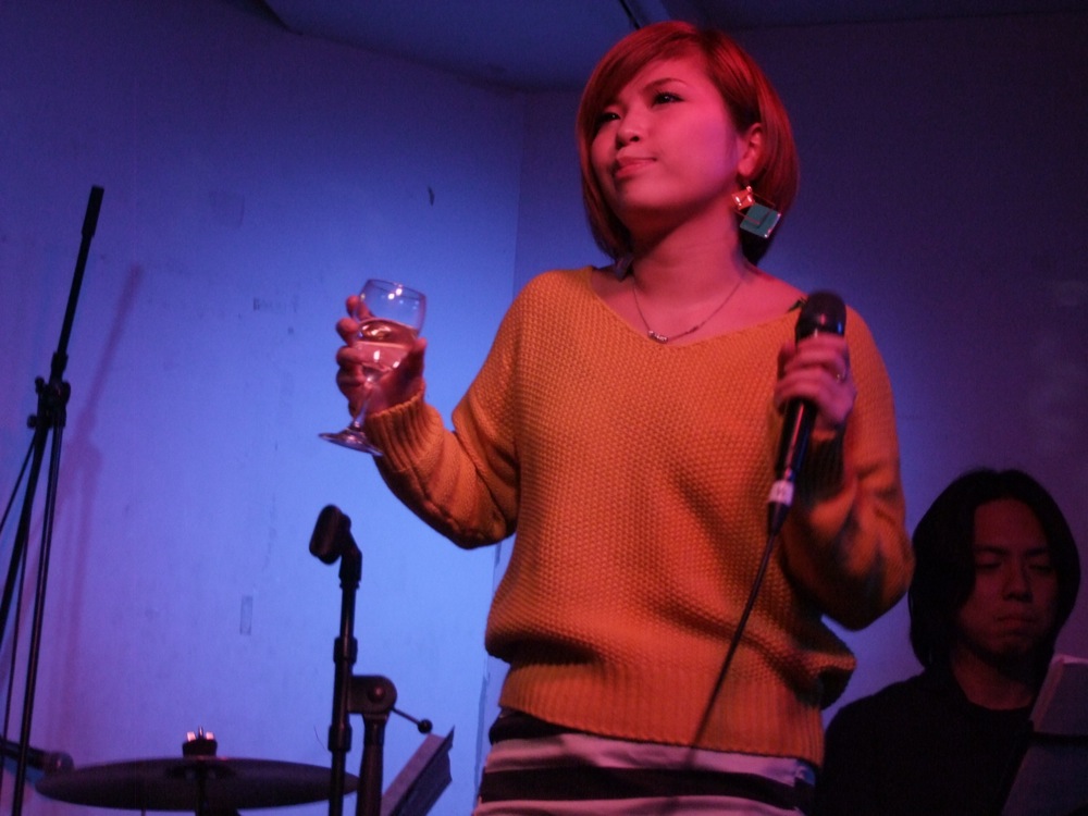 この時点で、自分達もお酒を嗜んでしまっているので(笑)、そのステージングも冷静に見ている…というよりは、何となく楽しくなって聴いてしまっている…という感じでしたが、その雰囲気がまたこのお店によく合っていて、自然な時間が心地良いひと時でもありました。これは、自分達も良いライブが出来そうではないですか…。そんな時に彬子さんを見ると、既に片手にはグラスワインが控えており、準備万端を思わせるに充分な時間を過ごしているのは、見るまでもないという状態でした。