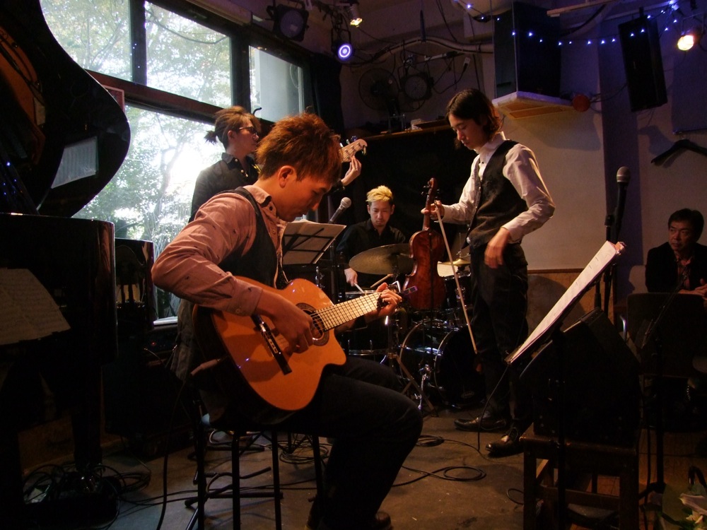 また、お店の楽屋こそ、よく出演させて貰っているお店の内の1つですが、お昼での出演という状況は恐らく自分は初めてだったのではないでしょうか。楽屋はステージの後ろがガラス窓であり、外の状況もよく見えるのですが、それが演奏中にも明るかったというのは、少し不思議な感じでもありました。お昼にライブを行うのは、やはりこの日のように、日曜日のお昼にしか来られないお客さんも多いから…という配慮でしょう。お子様連れの方も何人かいらっしゃていたのは、嬉しい限りでもありました。