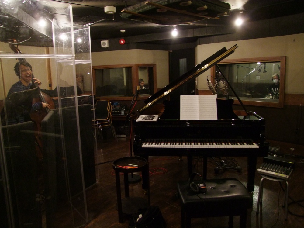 そして、そのメンバーの組み合わせにより、ピアノが自分、ウッドベースが池田暢夫君、そしてドラムに佐々木俊之さんという状況になる事がありました(笑)。正に自分のピアノトリオのメンバーで、池田君に至っては、1度 ERNESTO-CIELO のライブを手伝った以後、いきなりのレコーディング参加です(笑)。エレキベース担当の太田太君と対面(左上写真参照)したのも面白かったですが、既に 2nd. アルバムに向け、具体的な動きに入っていると認識出来た瞬間でもありました!…レコーディングの場所も、前回に引き続いてスタジオ DeDe にてで、ピアノも堂々とスタインウェイで、最高のクオリティーで録音させて頂きました!