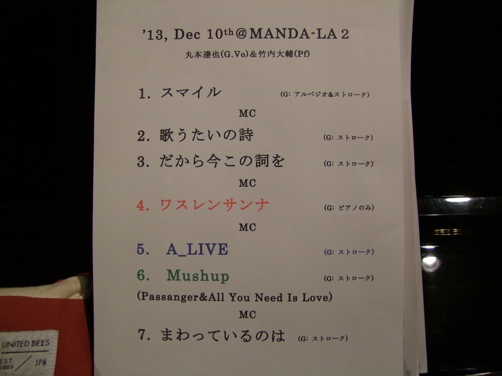 丸本さんと自分の本番の日の過ごし方は、まず、お店に入る前にスタジオに入り、リハーサルを兼ねた確認作業を行うところから始まります。そして、この時にセットリストも改めて渡されるわけですが、いつのまに選曲がカラフルな事になっています(左上写真参照)。