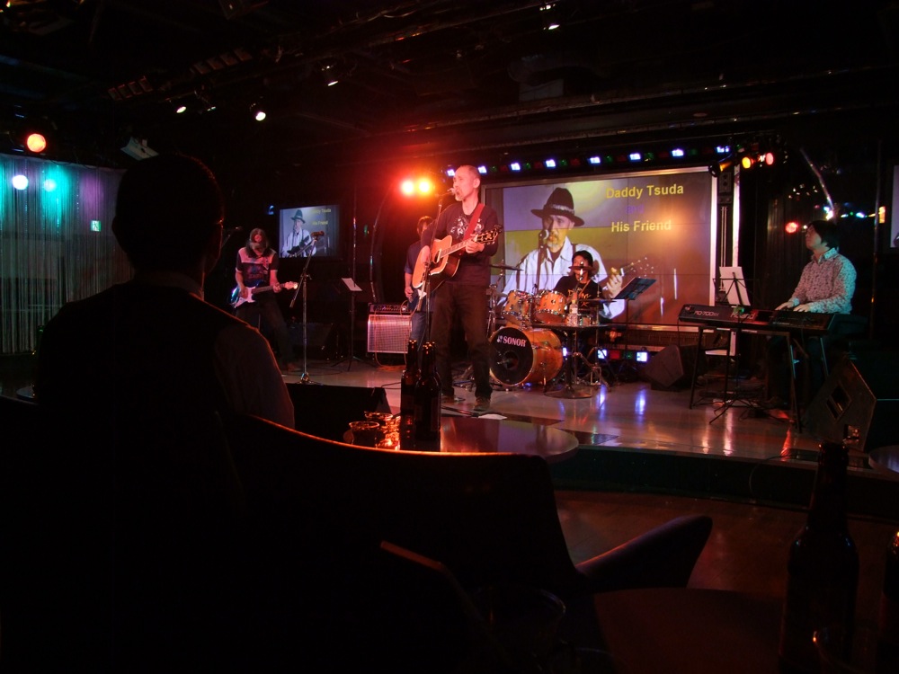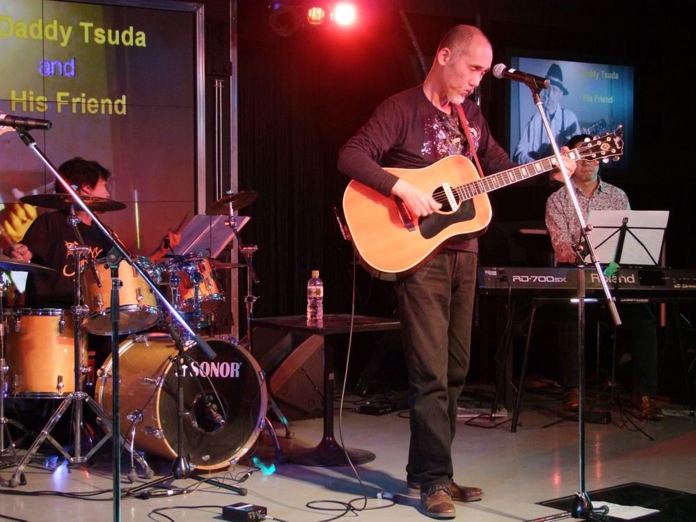 また、今回のツアーは基本、Daddy さん1人で回っているのですが、この関東滞在中に行われるライブは、ギター・コーラスのちきぴーさんも参加していて、しかもこの日のライブに限り、ベース、ドラムを加えたバンド形式で行う事としており、今までとは違う『Daddy 津田バンド』の言わば東京初ライブとして、大々的に君臨させたものとなったのでした…。ステージの後ろのスクリーンには、Daddy さん本人の姿が映し出されており、確かに背筋がピンと張るような状況でもあったように思います。