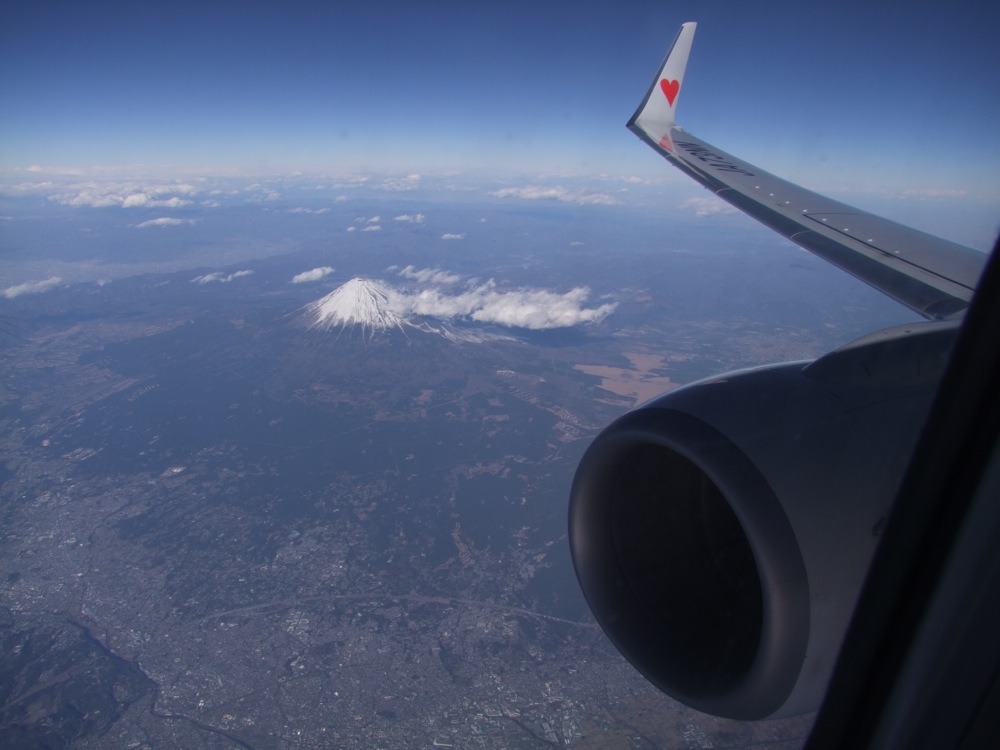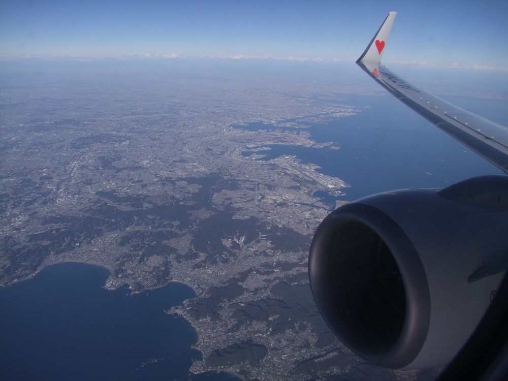 沖縄行きと言えば、何度もお世話になっているスカイマークです。最近は全日空利用が続いたので、少し久し振りではありましたが、相変わらず元気のあるエアラインです。いつの間にか日本全国で見掛けるようになりましたが、このエアラインの安さのお陰で、色々な演奏ツアーが実現しているような部分もあり、改めて感謝しなければいけないのかもしれません。この日の関東地方は空気が澄んでいて、三浦半島から横浜までの俯瞰(右上写真参照)や、当然富士山も見渡す事が出来ました(左下写真参照)。やはり、東京発西行き方面に向かう飛行機は、右側の窓側席に限ります!